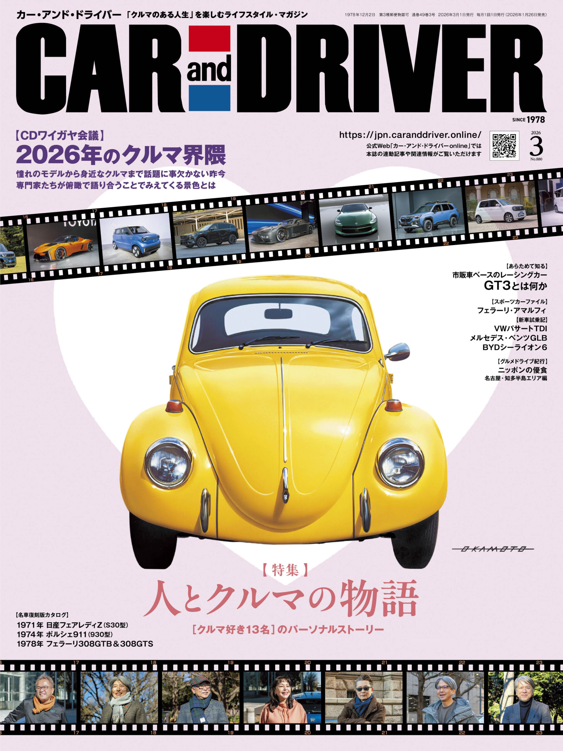 憧れのモデルから身近なクルマまで話題豊富な2026年、巻頭企画はプロがクルマ界隈を本音トーク。5つの視点で解き明かす。特集は「人とクルマの物語」。クルマ好きはどんな愛車と生活してきたのか。13名のパーソナルストーリーをクルマを軸に大紹介。新車情報もフェラーリ・アマルフィ、VWパサートTDIなど盛りだくさん。