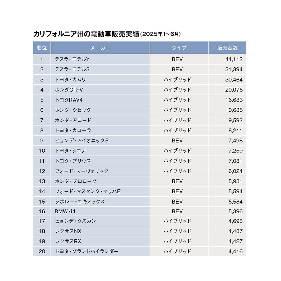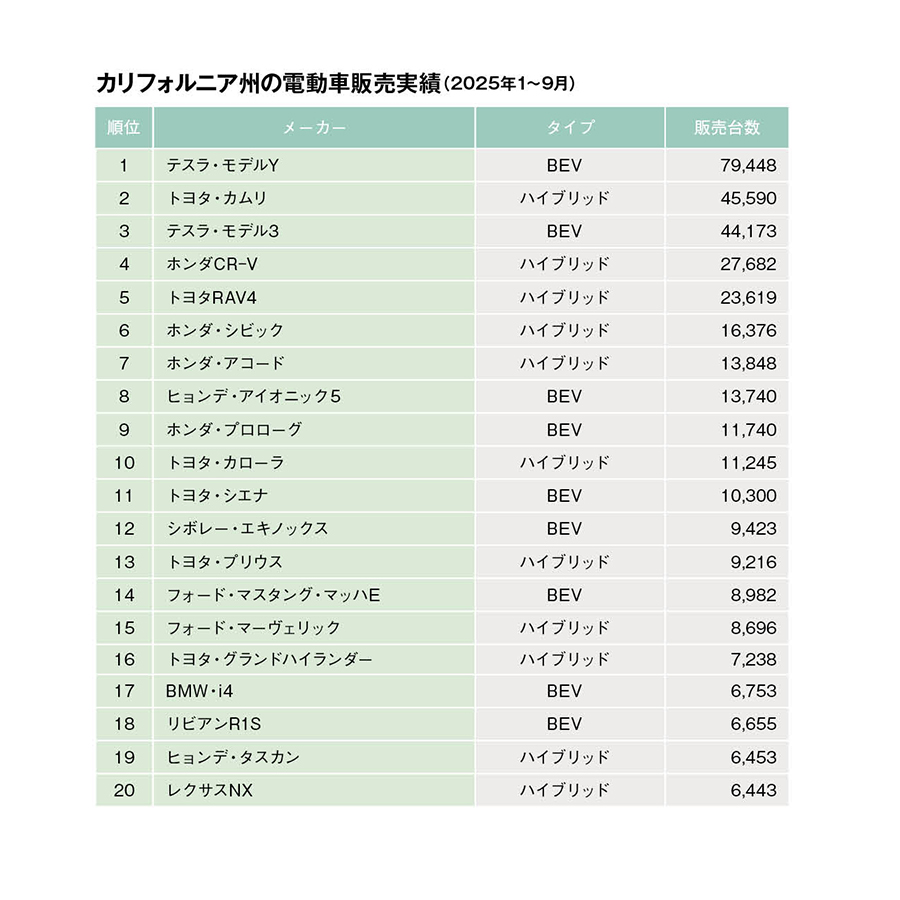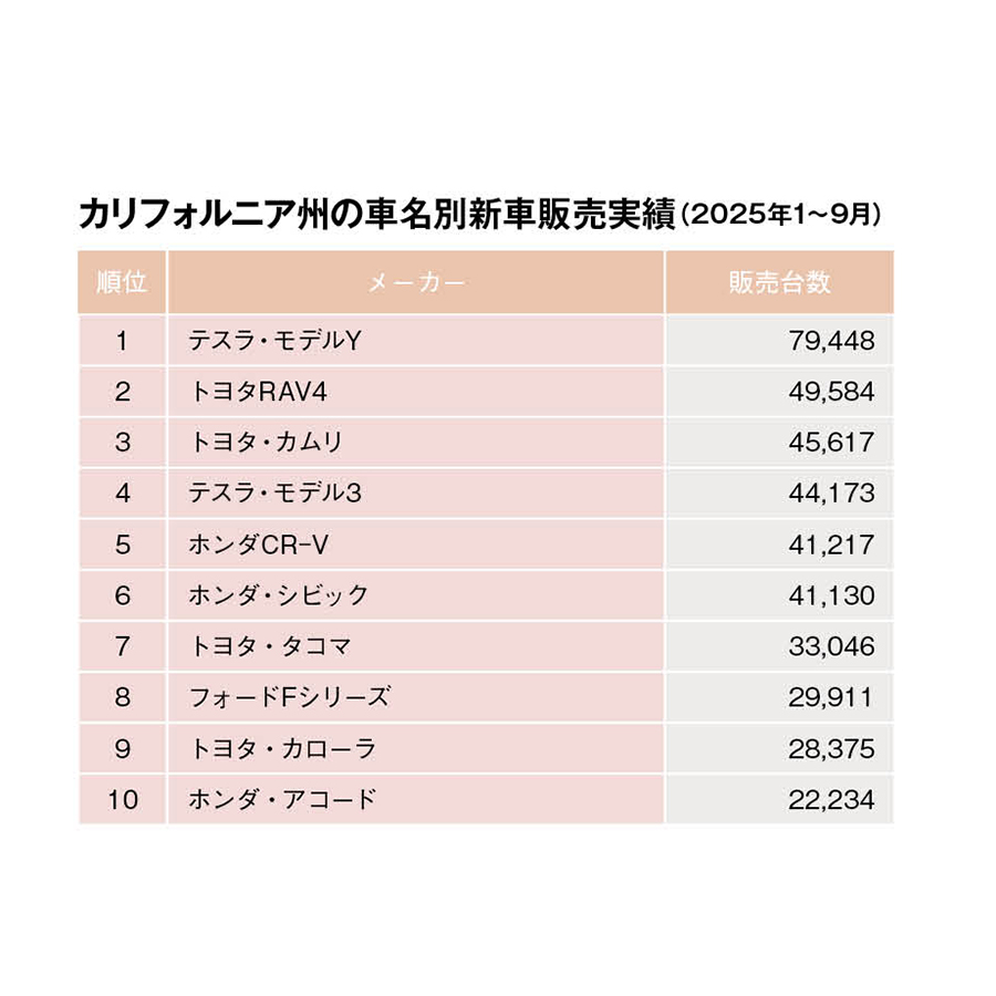 カリフォルニア州の新車販売を車名別販売データで見ると、テスラ・モデルYがトップの状況は2025年Q2と同じだが、モデル3はトヨタ・カムリに抜かれて4位にポジションを下げた。トップ10を構成するモデルは、2025年に入って変わっていない。
