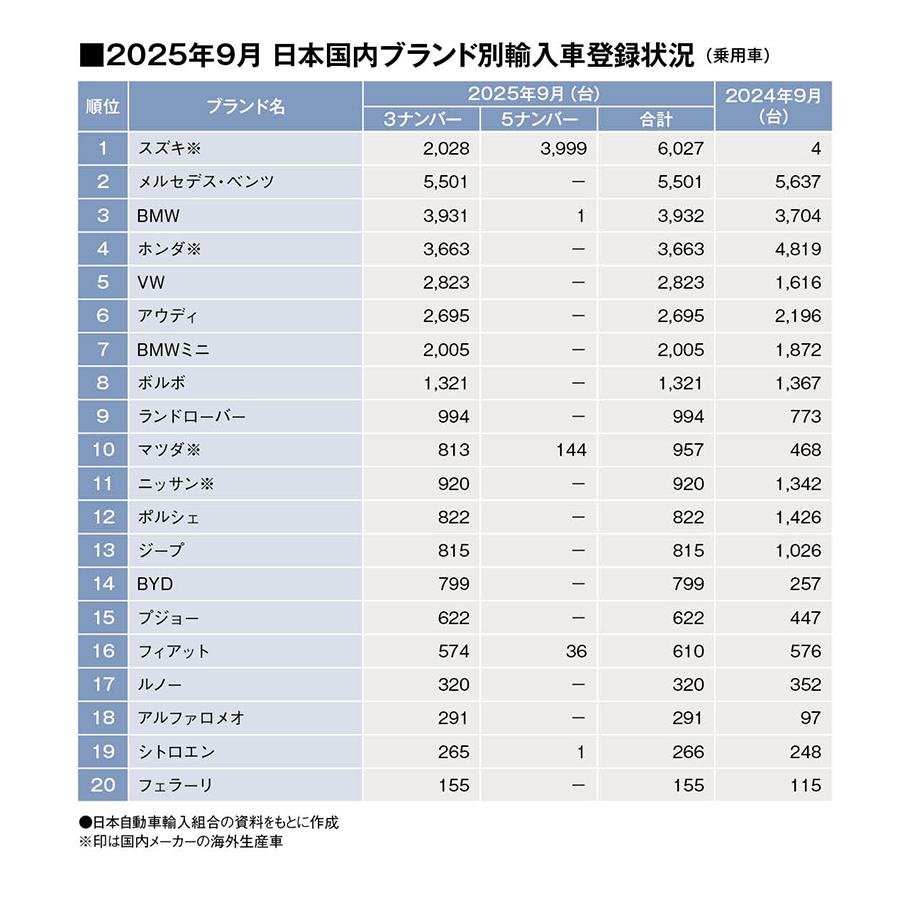 9月ランキングの首位はスズキ。7月末からおよそ1カ月出荷停止されていたジムニーノマドの登録が上乗せされた。ノマドの登録台数は3999台、フロンクスのセールスも2000台以上と好調で、6月以来のトップ。2位以降はメルセデス・ベンツ、BMWが前年並みのセールスで続く。5位VWが前年同月比175%と好調だ。