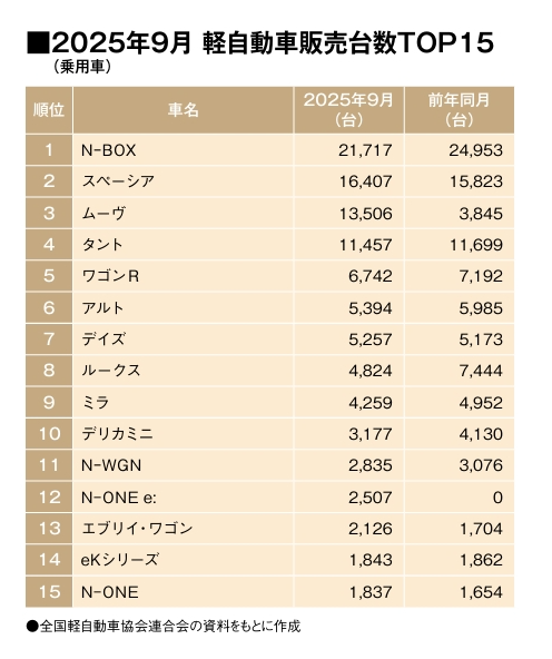 2カ月連続で前年実績割れだった軽乗用車市場も需要期9月は少々復調、前年比101.7%とかろうじて前年超えに。ランキングでは、TOP4が前月と変わらない顔ぶれに。N-BOXが前年87%ながら、首位を維持、新型ムーヴも好調を維持している。