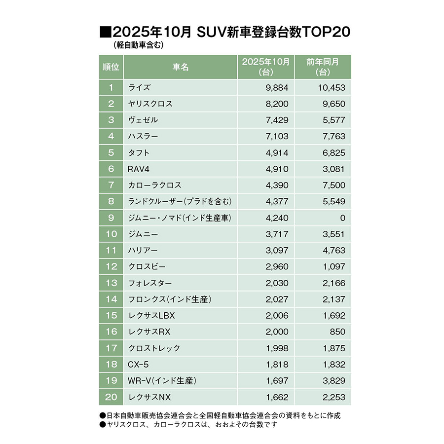 2025年10月のSUVマーケット(軽自動車や国内ブランド輸入車を含む)は、前年同月比で91.0%と前年実績を下回った。(本誌調べ)SUVやミニバンが中心となるマーケット、普通乗用車(3ナンバー)の販売台数は、14万1251台、前年同月比–8.4%と7カ月連続で前年実績を下回った。外国メーカーの輸入車は今年に入ってから毎月前年実績超えと好調だが、国産乗用車は低調が続いている。
