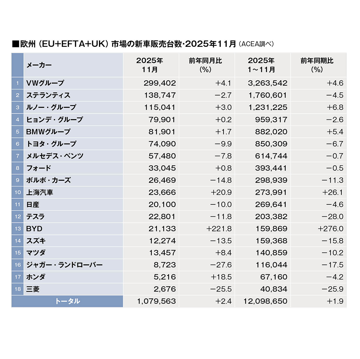 だが、ACEAのデータを見る限り上海汽車1〜11月販売は前年同期比比26.1%増と、追加関税の影響は感じられない。BYDは前年実績値が小さいため増加率は桁違いになっているものの、年間販売台数20万台は来年には確実に達成しそうである。月販平均2万台超えは現実的な数字といえるから、2026年には30万台を超える可能性も考えられる。
