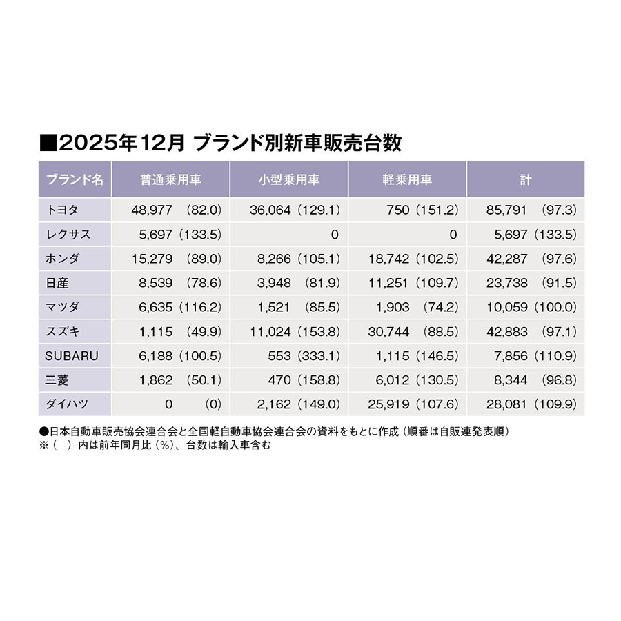 全体ランキングではホンダN-BOXが2カ月連続の首位。25年度の暦年でも20万台以上をセールスし、新車乗用車販売1位を獲得した。
