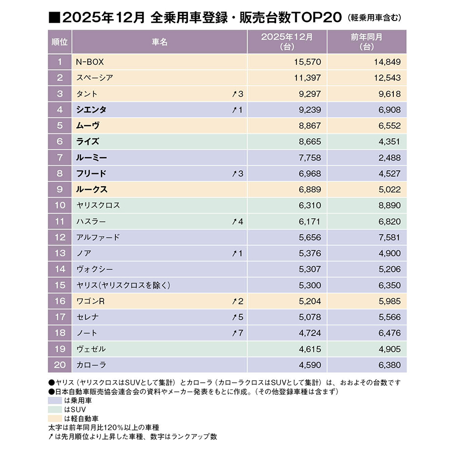 また、上位陣ではダイハツ・ムーヴが5位に後退、タントが3位に上昇している。登録車首位はトヨタ・シエンタ、全体で4位にランクアップ。上位登録車の多くが前年を大きく上回る販売結果となった。