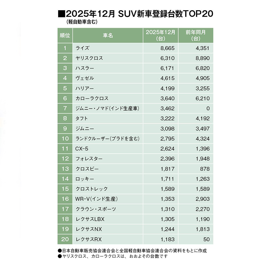 2025年12月のSUVマーケット(軽自動車や国内ブランド輸入車を含む)は、前年同月比で95.3%と前年実績を下回った。(本誌調べ)SUVやミニバンが中心となるマーケット、普通乗用車(3ナンバー)の販売台数は、11万7460台、前年同月比–11.6%と8カ月連続で前年実績を下回った。