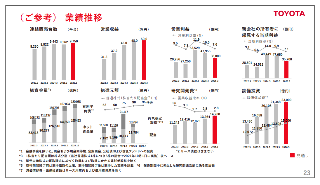 2026年3月期の損益分岐台数の見通しは、ここ10年で最も高い2017年3月期の値に近くなっている。しかもグラフは2024年3月期のボトムから一気に上昇傾向にある。2023年3月期のピョコンと上がっているのはおそらく半導体不足に悩まされた時期だろう。直近ではさまざま物資の値上がりや物流費、人件費などすべてが高まる一方で、損益分岐台数の上昇は営業利益の圧迫に直結する。わかりやすくいえば、クルマをたくさん販売しても利益が出ない方向に近づいているわけだから、これは問題だ。トヨタは固定費削減や原価改善、バリューチェーン全体の収益向上に取り組み、単なるコストカットでなく持続的な活動となるよう推進し、来期以降の本格反転につなげていくという。