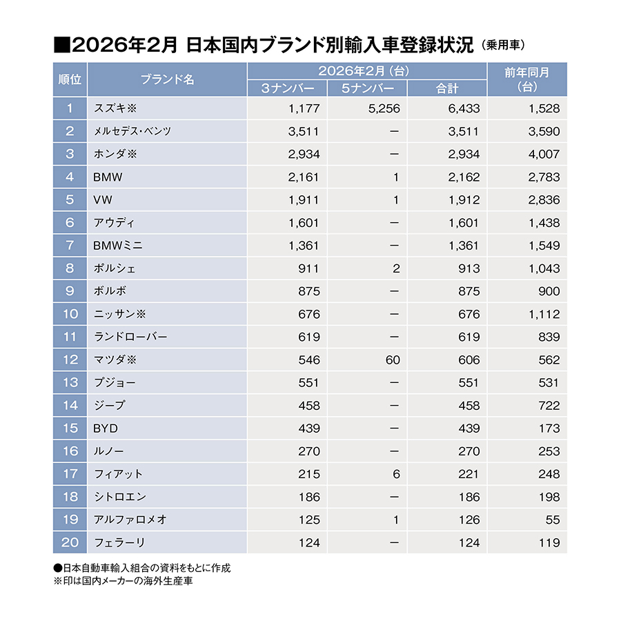 2月の外国車メーカーの輸入車(乗用車)登録台数は1万7351台。前年同月比は94.2%となり、2カ月連続でに前年販売を下回った。昨年は13カ月連続、通年で前年実績を上回った輸入車マーケットだが、2026年は厳しいスタートとなっている。スズキの伸長により、日本メーカーの輸入実績は依然好調、同比146.6%、3カ月連続で前年実績を上回った。