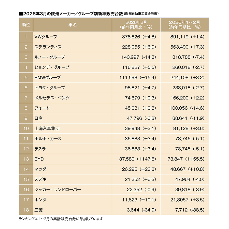 ACEA(欧州自動車工業会)は4月23日、3月のメーカー/グループ別新車販売台数データを発表した。トップはVWグループで376万8826台。前年同月4.8増で、1~3月の第1四半期で見ても、1.4%増である。シュコダが第1四半期に22万2528台を販売し、前年同期比15.7%増の奮闘し、34万7708台を販売したもの5.0%減にとどまったフォルクスワーゲンの足踏みを補った。