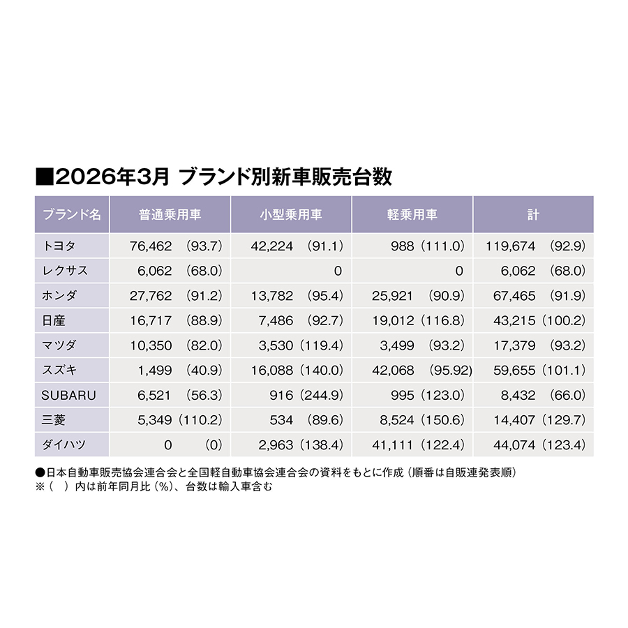 3月の登録乗用車の新車販売台数(商用車を除く)は26万538台で、前年同月比ー7.9%と9カ月連続の減少。セグメント別では、普通乗用車は、17万7775台、同ー11.8%、11カ月連続の減少。小型乗用車は8万7663台、+1.1%、2カ月ぶりの増加。軽乗用車は同+7.1%、3カ月ぶりの増加。