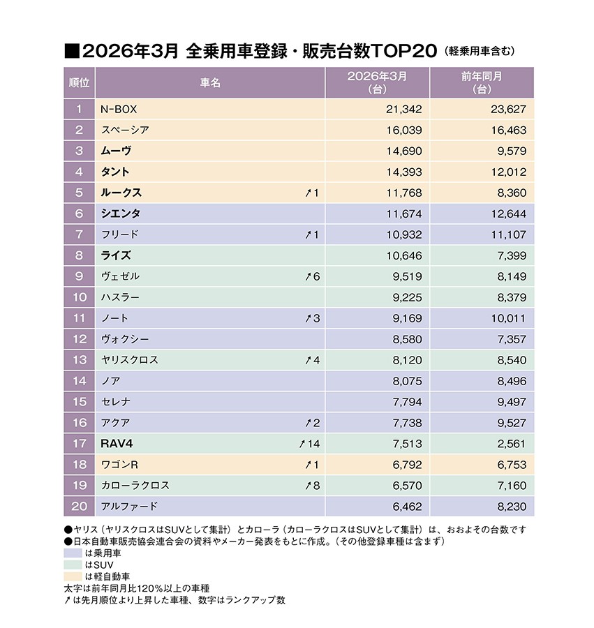 登録車首位はトヨタ・シエンタ。それに続くホンダ・フリード、トヨタ・ライズが1万台超えのセールスと低調なマーケットの中、存在感を見せている。それ以外のモデルでは、RAV4、bz4X、リーフ、クロスビーが大きく前年を超えるセールスだ。