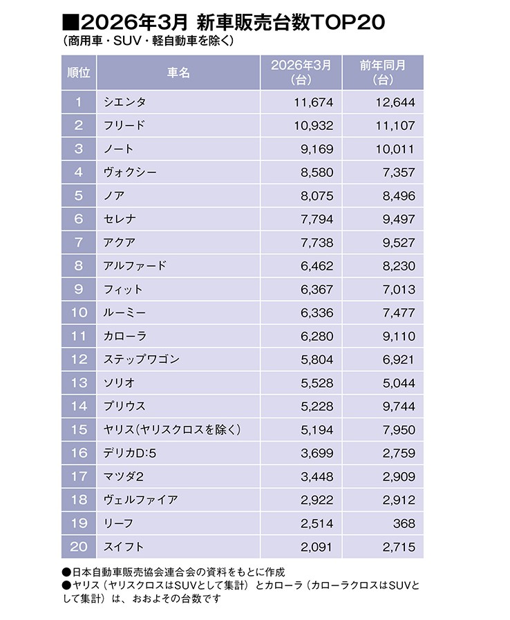 シエンタが5カ月連続の首位を獲得。2位には前月に続いてホンダ・フリードの様相となった。1月までは2位以下の順位が目まぐるしく変わっていたが、3位に最近好調の日産ノートが浮上、今後コンパクトカー三つ巴の闘いとなるか興味深い。