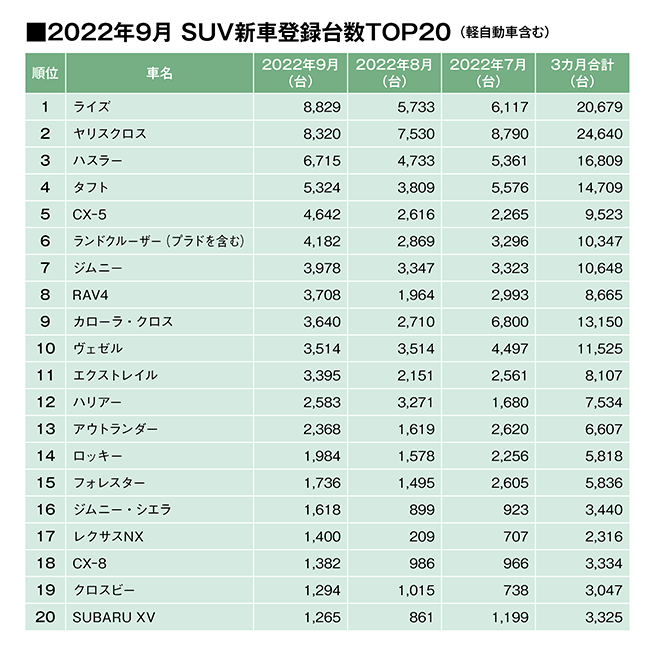 9月のSUV販売は2カ月連続でトップだったヤリスクロスを抑え、再びトヨタライズが首位