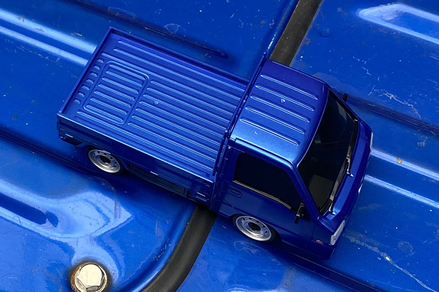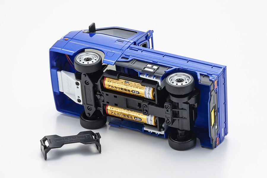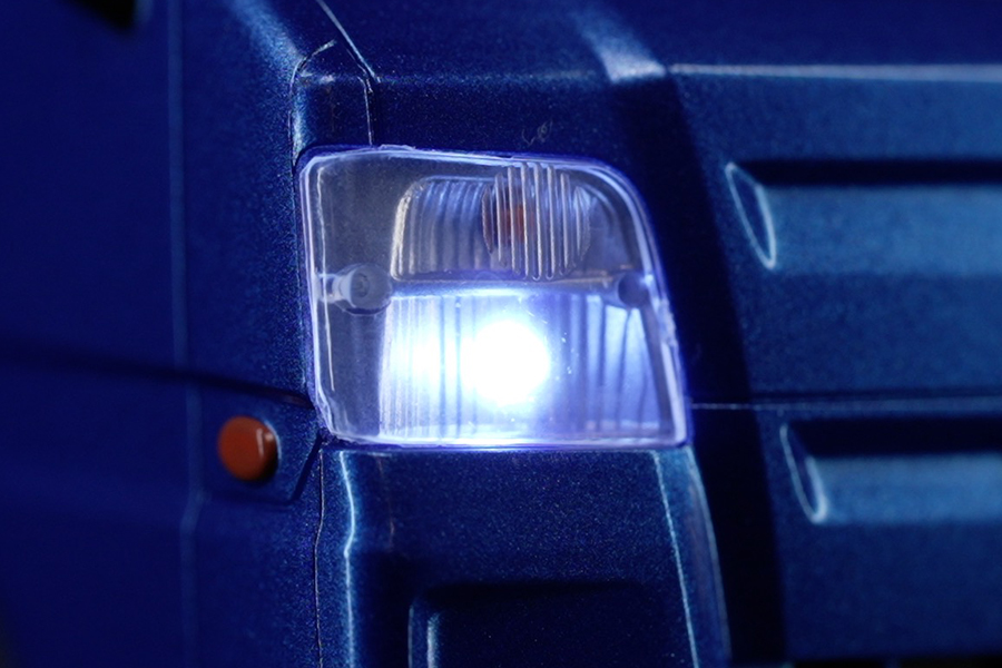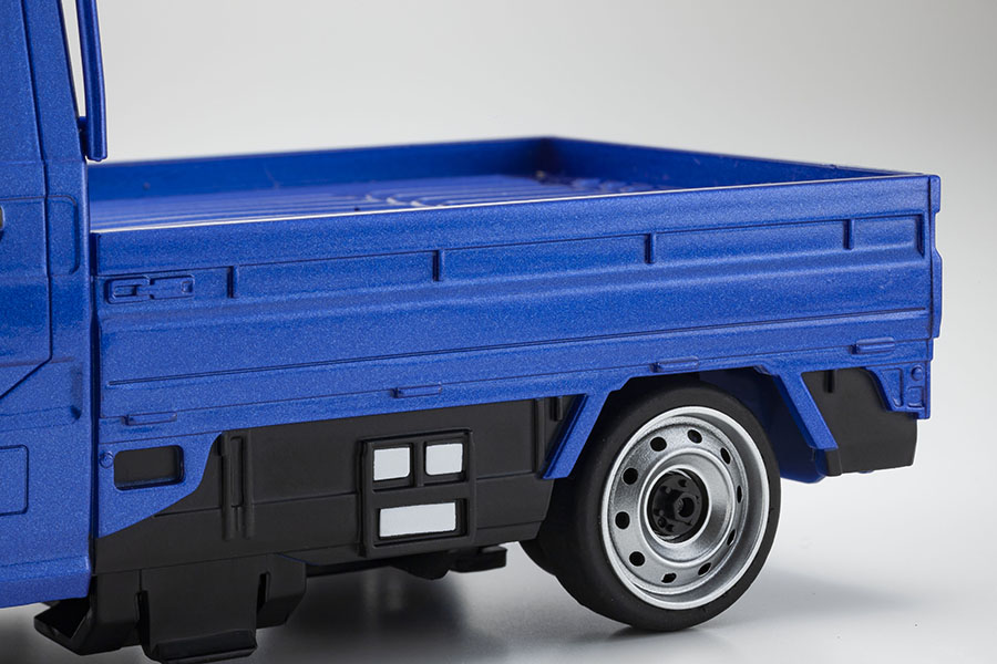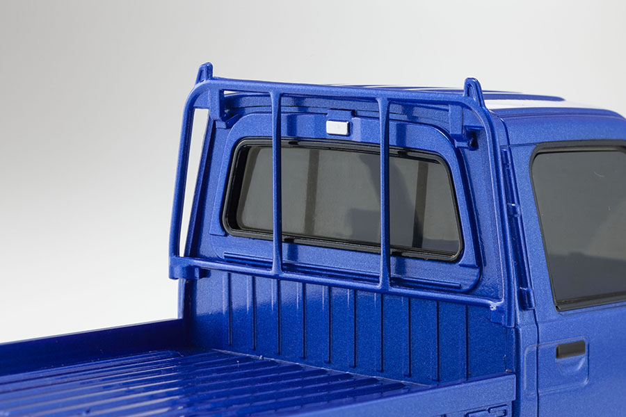 WRブルーリミテッドのブルーメタリックカラーを忠実に再現はもちろん、カーモデルとして大切なフェイスのディテール、リアガラスを保護する鳥居、エンジンフード、ヒンジ、エンブレム等、荷台の作り込みにも傾注。モノを積んだり、ドレスアップ等、ユーザーの遊び心を加えることで、インテリアグッズや小道具として幾通りにもディスプレイを楽しむことができます。走行時にはヘッドライトとテールランプが点灯し、R/Cモデルとしての臨場感もバッチリです。