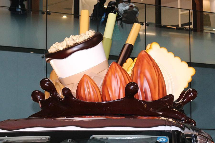 ルーフに載ったアーモンドやポッキー、ビスコなどの制作にはコンセプトカーやクレイモデルの開発で知られるSIVAX(シバックス)が担当している。参考までにポッキーは実際の16倍、ジャイアントコーンは8倍、アーモンドは20倍、キャラメルは24倍程度のスケールになっている。ホイールはプリンのイメージだ。