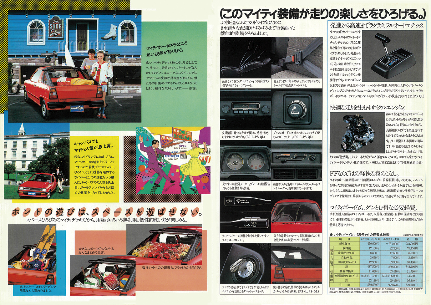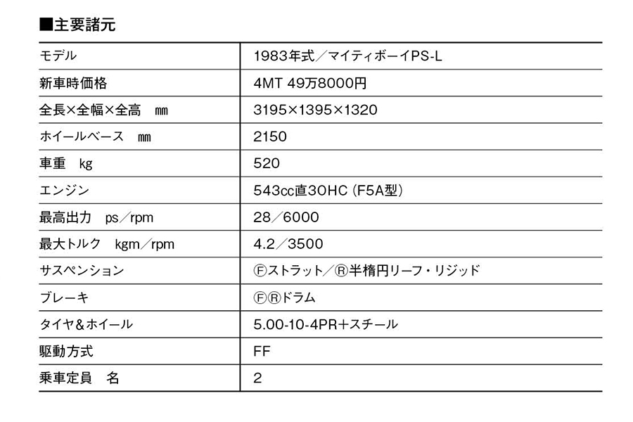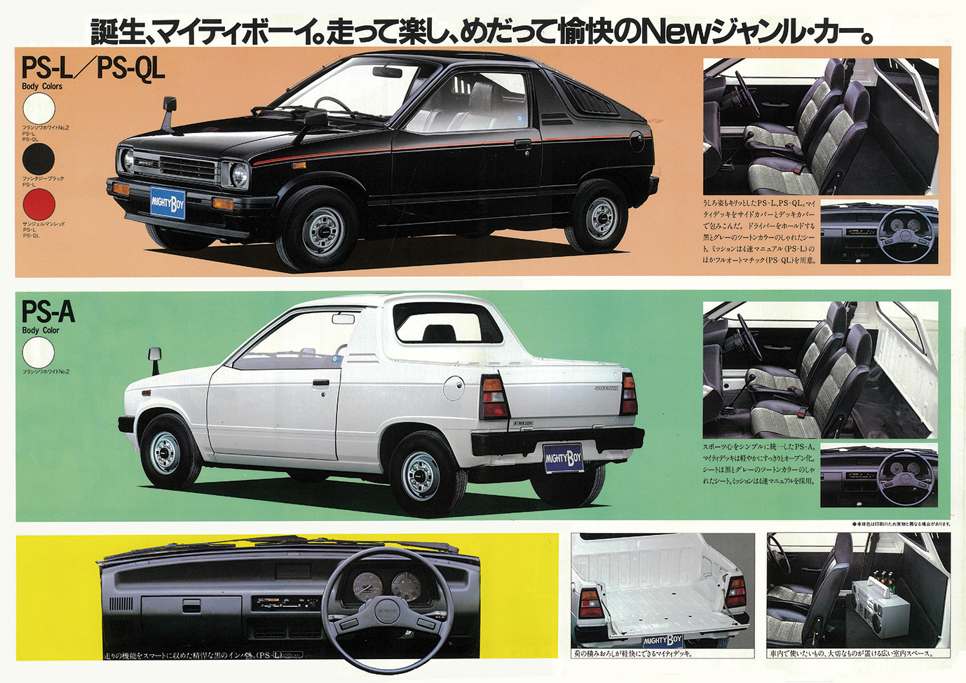 スズキ・マイティボーイは、クーペフォルムのセルボをベースにしたパーソナル・ピックアップとして1983年2月にデビュー。カタログでは“小粋で気軽なデイパック・カー”と表現し、4ナンバーの商用モデルながら“遊びのクルマ”の魅力を強調。ラインアップはベーシックなPS-A(45万円)と充実装備のPS-L(49万8000円)、PS-LをベースにしたAT仕様のPS-QLを設定していた