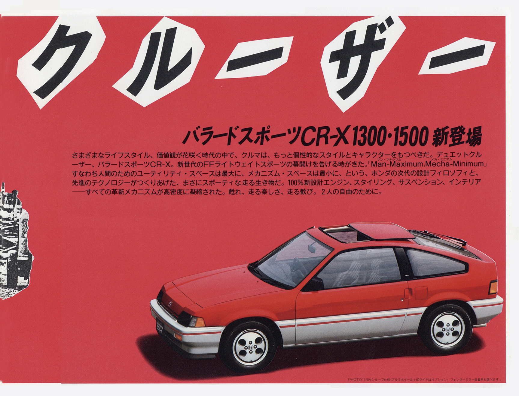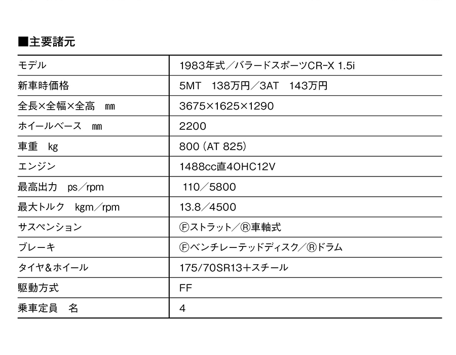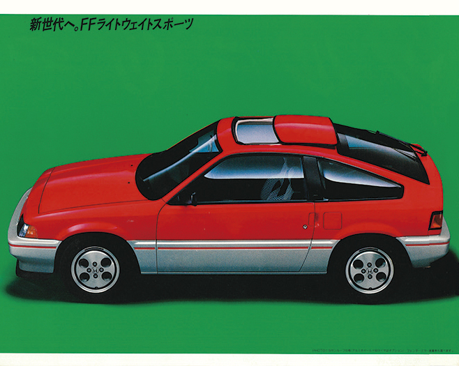 初代バラードスポーツCR-X(2代目以降はCR-X)は、主要メカニズムを共用する3代目シビックより2カ月早い1983年7月に登場。鮮烈スタイリングと剽悍な走りが魅力の「FFライトウェイトスポーツ」だった。ボディサイズはコンパクトな3675×1625×1290㎜。車重は800kg(1.5i)と超軽量。カタログでは「ホンダの次世代設計フィロソフィーと先進テクノロジーがつくりあげた、まさにスポーティな走る生き物」と表現した