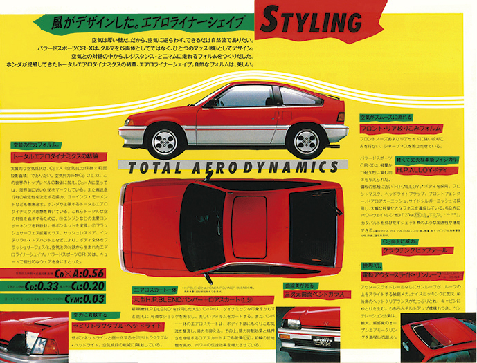 サイズは3675×1625×1290㎜。シビック3ドアよりひと回り小さい。このコンパクトさとダイナミックなスタイリングのコンビは、いかにも「コレは走るな」と楽しい予感を抱かせる。CR-Xのスタイリングは大胆でユニークだ。Cd値は0.33。しかも前面投影面積が小さいから、空気の壁を切り裂く能力は超一級品である。