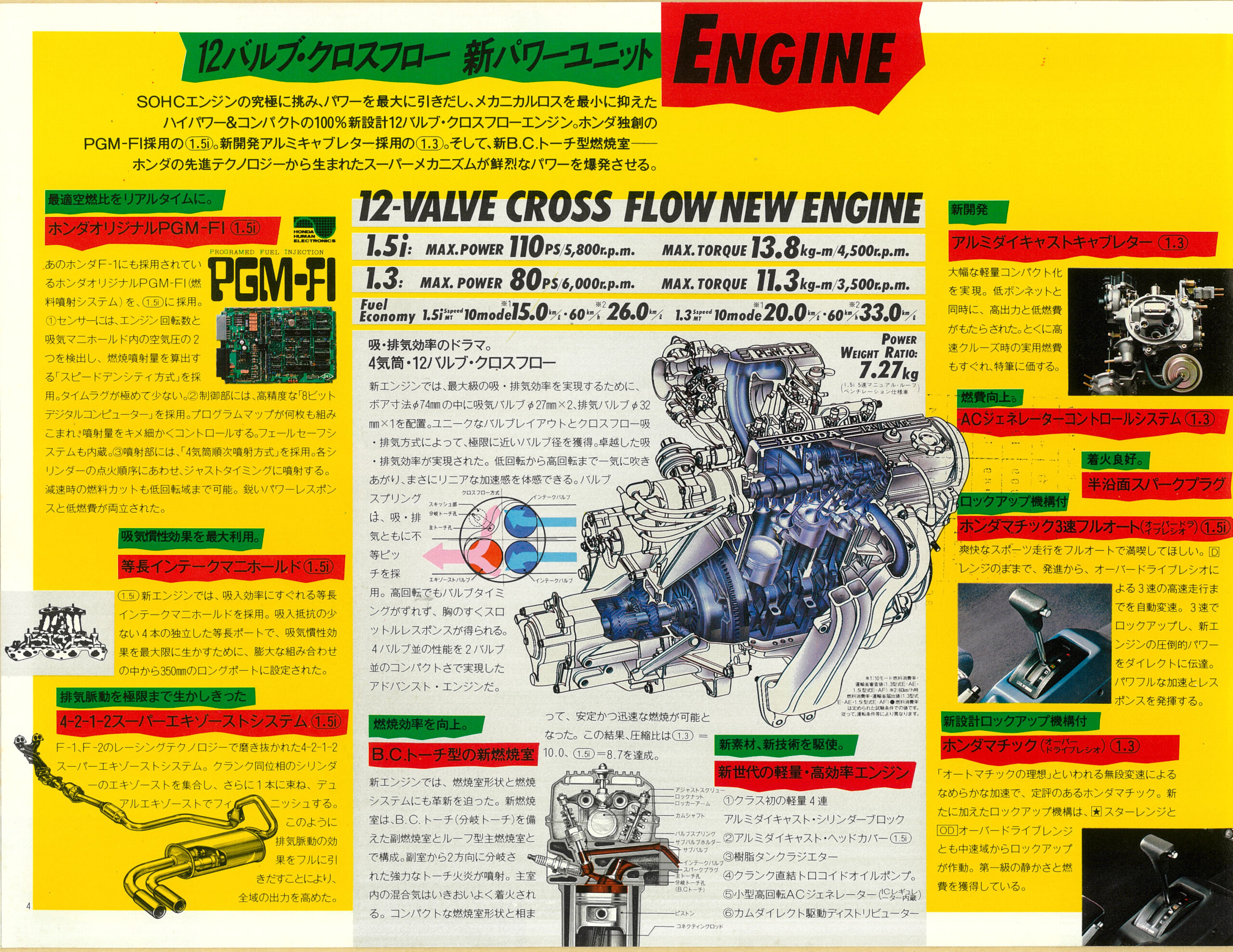 エンジンは1.3リッターのキャブレター仕様と、1.5リッターの電子制御燃料噴射仕様の2種を用意している。どちらも吸気2、排気1の3バルブ方式を採り入れ、燃焼効率を徹底的に引き上げた新世代ユニットだ。