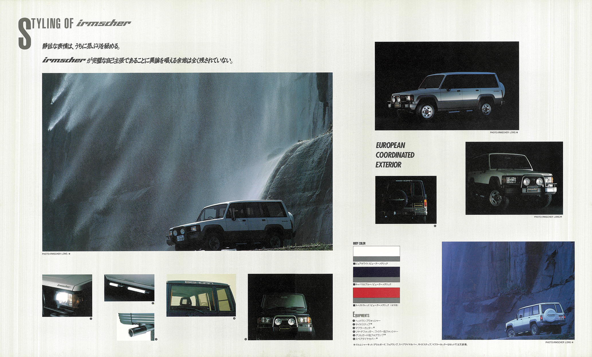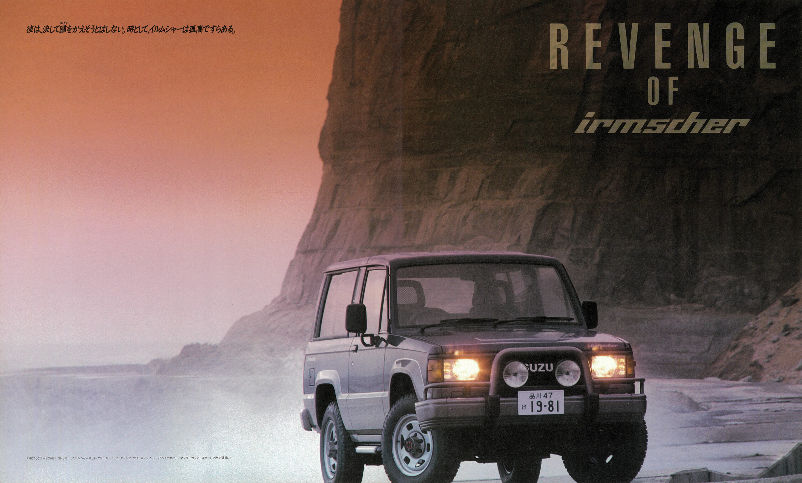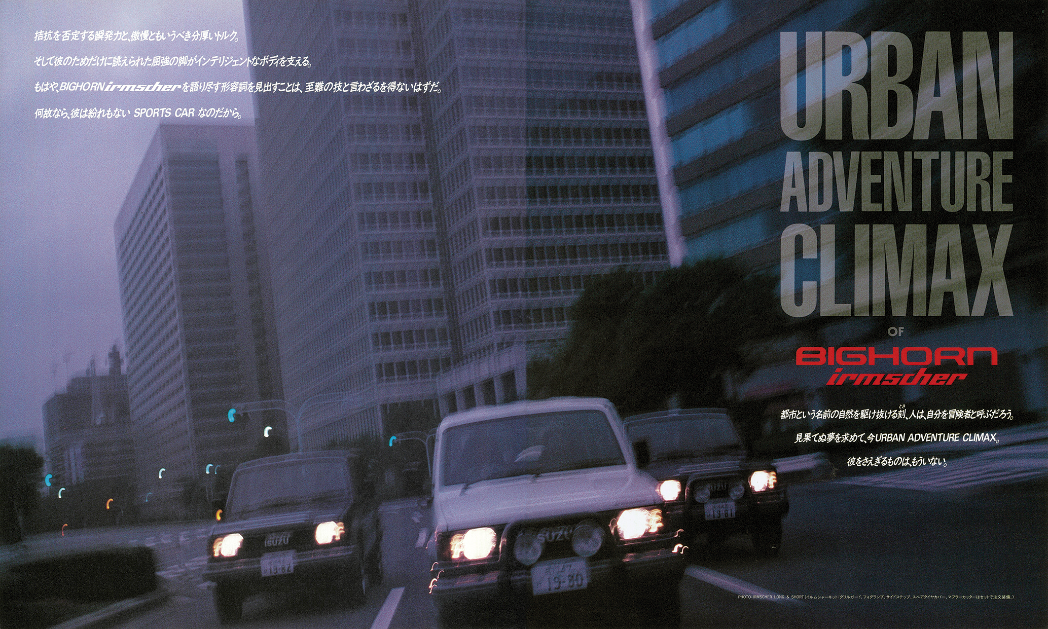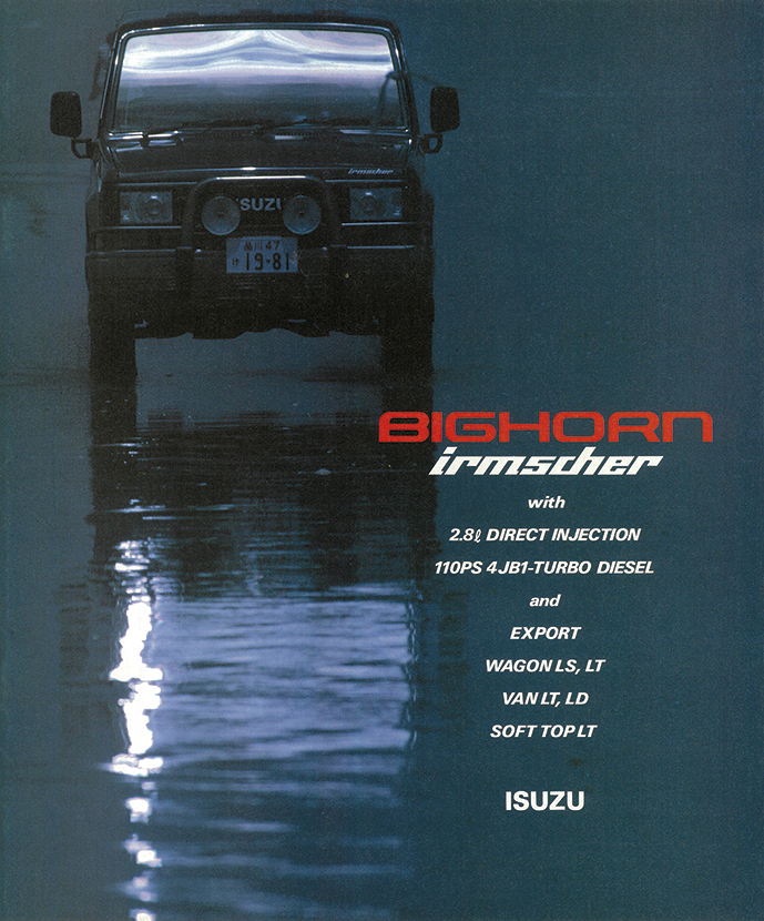 「1988年いすゞビッグホーン」(UBS55/UBS52型)の復刻版カタログ。カタログは1988年4月版(原寸297×247mm、30㌻編集)。ビッグホーンはパジェロに先駆け1981年に登場。タフな走行性能と快適性の高次元融合が評価され、根強いファンを獲得する。ビッグホーンの個性は、いすゞならではのスポーティフィールの演出。1987年10月に、ピアッツァや、ジェミニで好評を博していたイルムシャー・グレードを新設定。“本格ヨンク”ながら、ライバルとは次元の違う“走りの歓び”を実現する。イルムシャーは、いすゞ自慢の2.8ℓ直噴ディーゼルターボ(110ps)を積み、足回りを専用チューン。ミシュラン製タイヤ、モモ製本革ステアリング、レカロ製シートを標準装備し、内外装も精悍に仕上げたスペシャルモデルだった。走りはシャープな味わいが印象的。ワインディングロードではスポーティカー顔負けのフットワークを披露した。ラインアップはショートホイールベース(WB2300mm/全長4120mm)とロングホイールベース(同2650mm/4470mm)の2種。ビッグホーンにはイルムシャー以外にも2.2ℓ直4ディーゼル(82ps)を積む標準モデルが用意されていたが、主役は間違いなくイルムシャーだった。