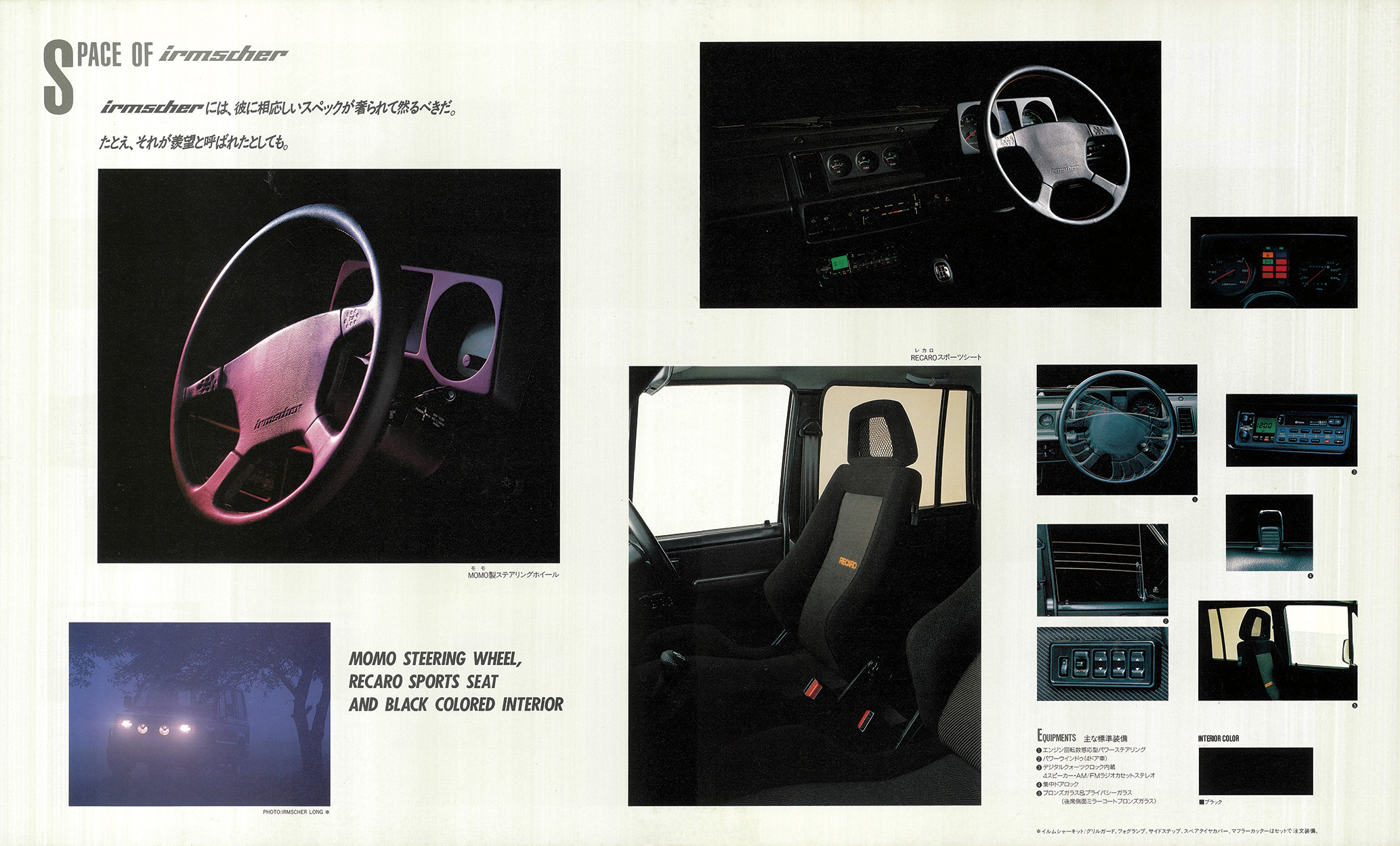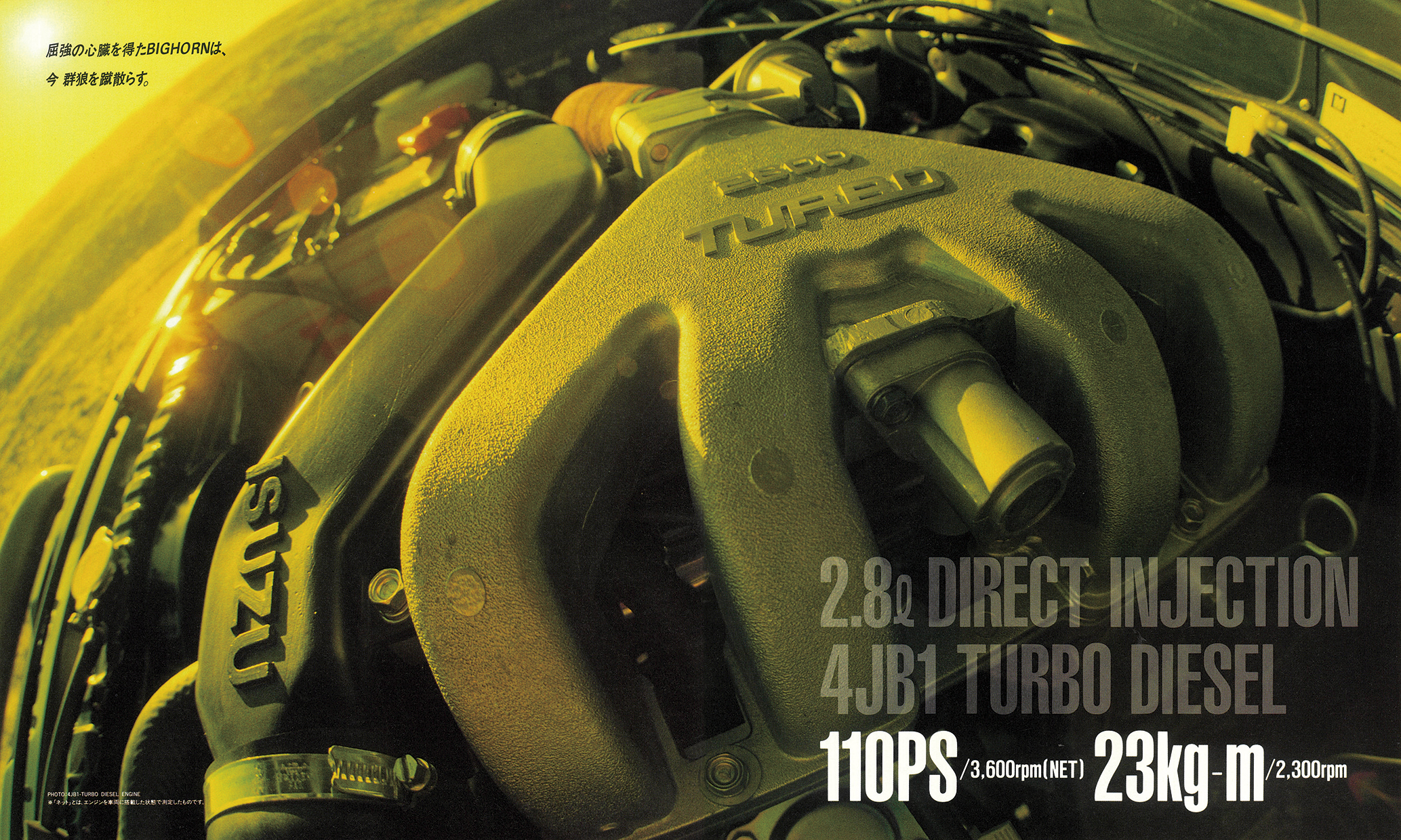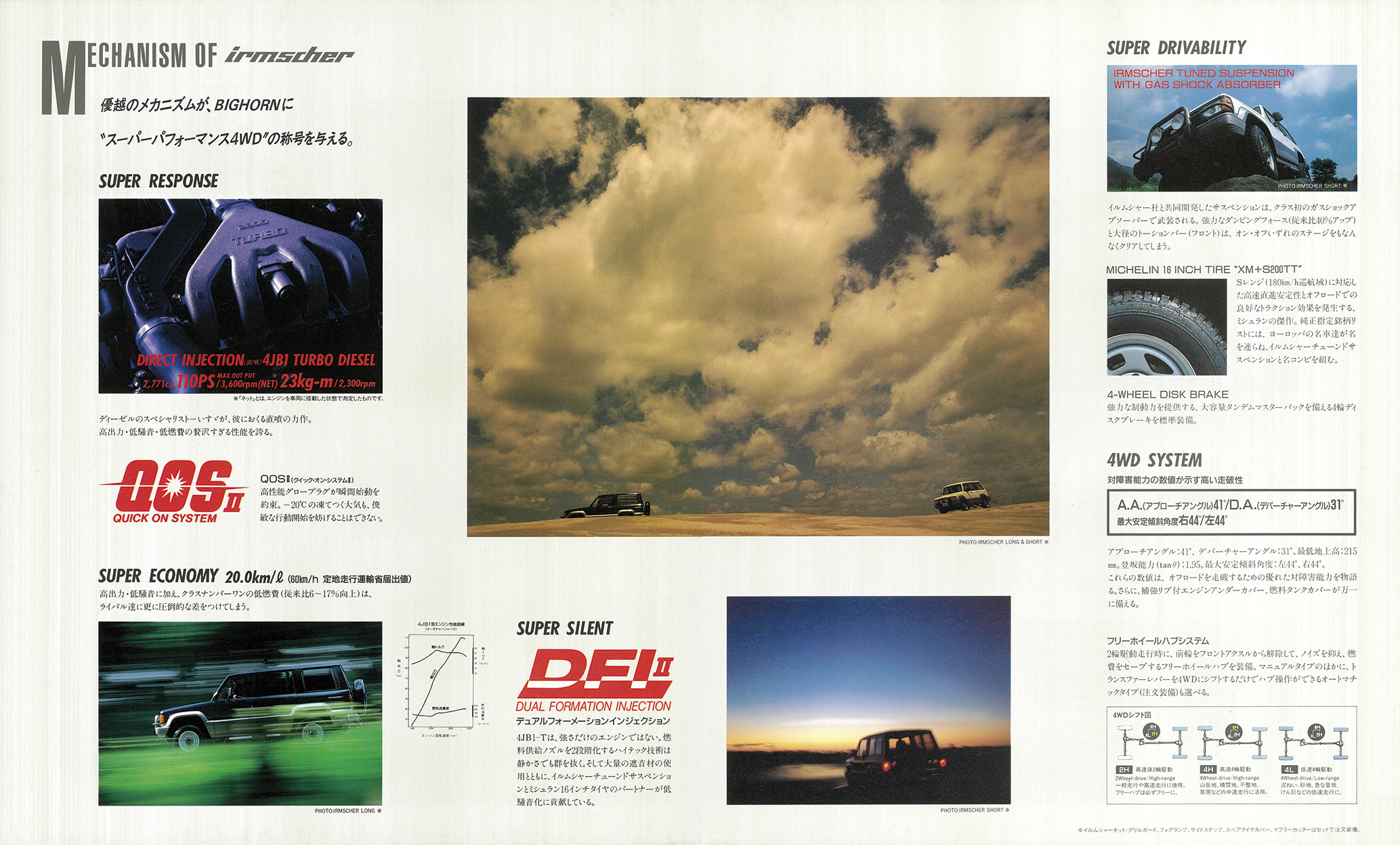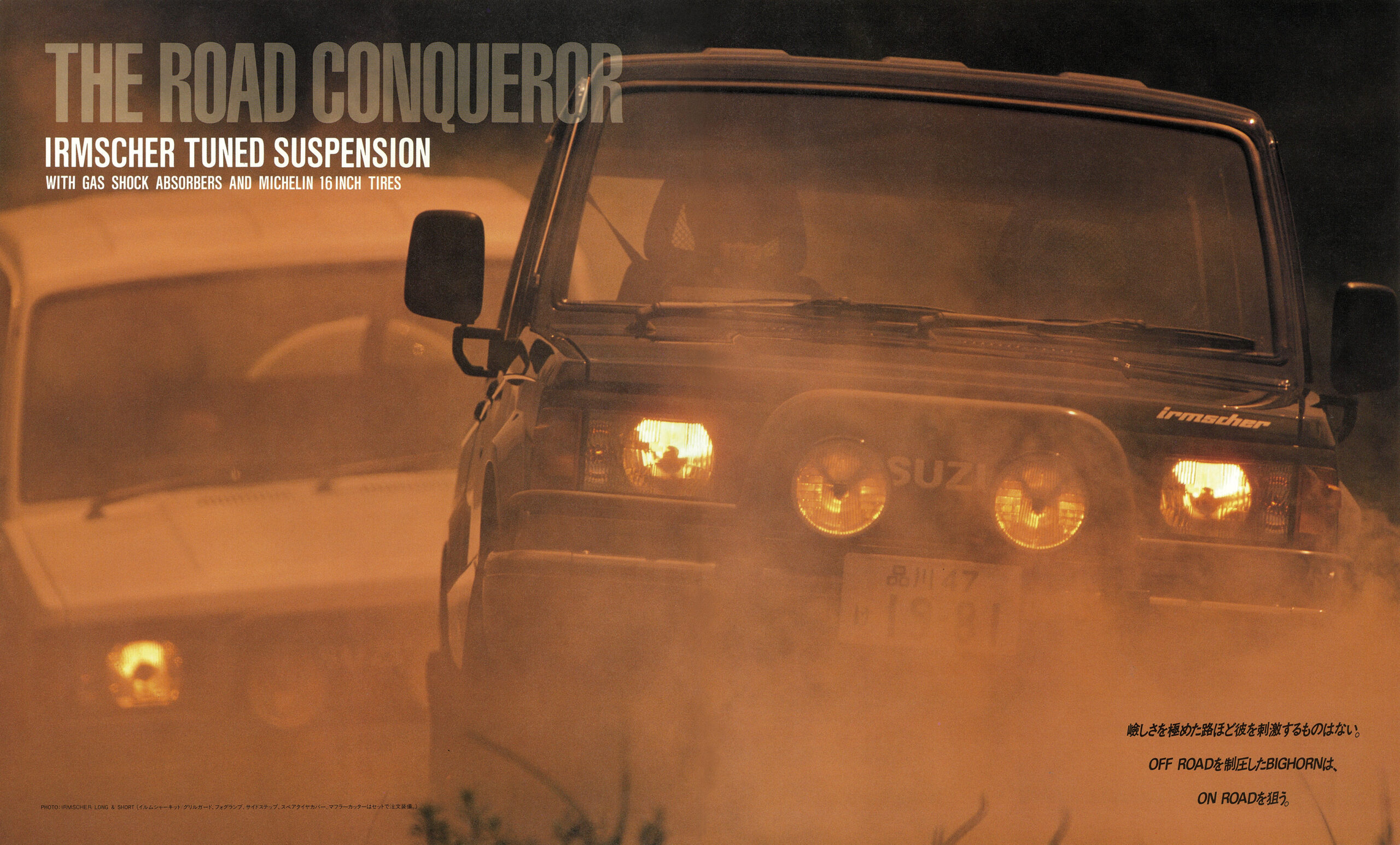 「1988年いすゞビッグホーン」(UBS55/UBS52型)の復刻版カタログ。カタログは1988年4月版(原寸297×247mm、30㌻編集)。ビッグホーンはパジェロに先駆け1981年に登場。タフな走行性能と快適性の高次元融合が評価され、根強いファンを獲得する。ビッグホーンの個性は、いすゞならではのスポーティフィールの演出。1987年10月に、ピアッツァや、ジェミニで好評を博していたイルムシャー・グレードを新設定。“本格ヨンク”ながら、ライバルとは次元の違う“走りの歓び”を実現する。イルムシャーは、いすゞ自慢の2.8ℓ直噴ディーゼルターボ(110ps)を積み、足回りを専用チューン。ミシュラン製タイヤ、モモ製本革ステアリング、レカロ製シートを標準装備し、内外装も精悍に仕上げたスペシャルモデルだった。走りはシャープな味わいが印象的。ワインディングロードではスポーティカー顔負けのフットワークを披露した。ラインアップはショートホイールベース(WB2300mm/全長4120mm)とロングホイールベース(同2650mm/4470mm)の2種。ビッグホーンにはイルムシャー以外にも2.2ℓ直4ディーゼル(82ps)を積む標準モデルが用意されていたが、主役は間違いなくイルムシャーだった。