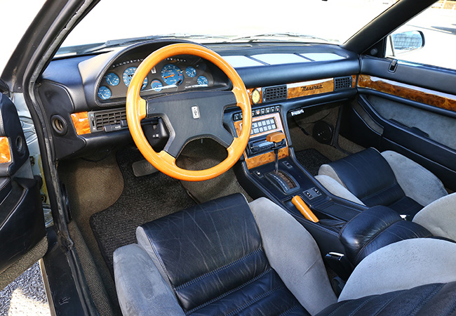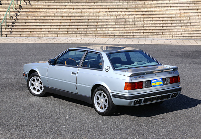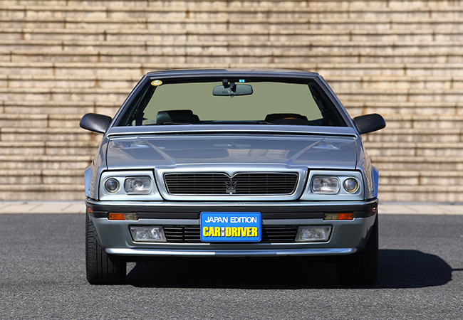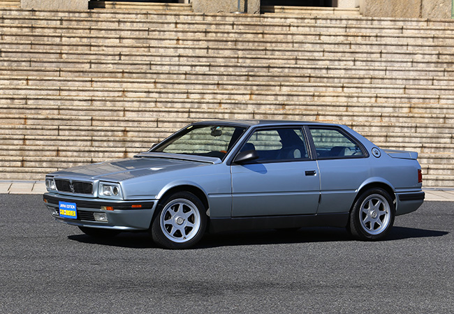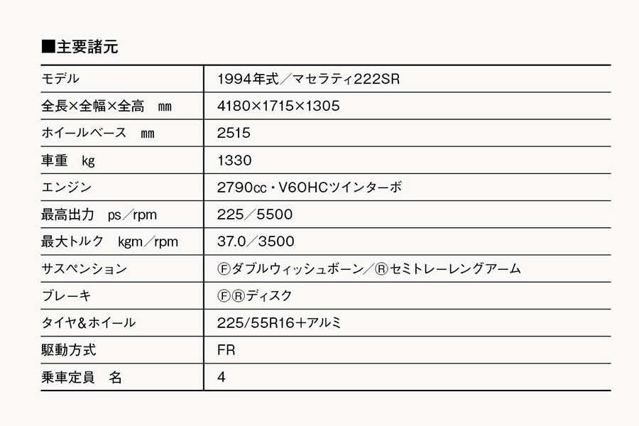 1994年式マセラティ222SR。222SRはデ・トマソが統治していた時期(1976年〜93年)の主力車ビトルボの最終型。コンパクトボディに2.8ℓ・V6ツインターボ(225ps)を搭載したGTスポーツ