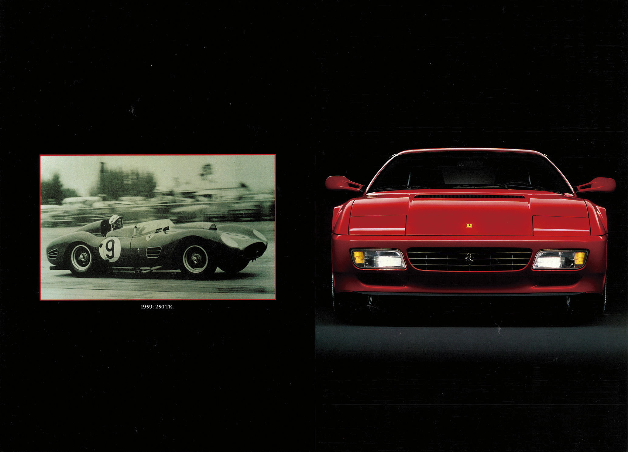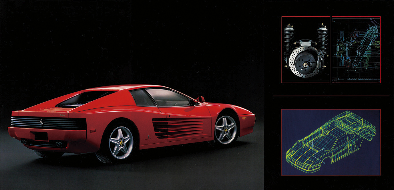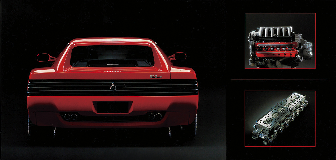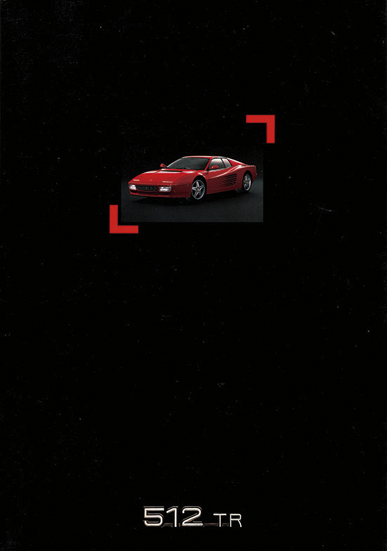 1990年代初頭のフェラーリを象徴したMRスーパースポーツ、「512TR」の復刻版カタログ。カタログは1991年11月版(原寸298×210mm、変形28㌻編集)。フェラーリ512TRは、1984年に登場したフラッグシップMRスポーツ「テスタロッサ」の発展版。1991年秋に1992年モデルとしてデビューした。512TRの「512」は、エンジン排気量の5リッターと、12気筒エンジン搭載車であることを示し、「TR」はテスタロッサ(=Testarossa)の略。パワートレーンは4942ccの180度V型12気筒DOHC(428ps/50.0kgm)と5速MTの組み合わせ。前後重量配分は41対59、ホイールは18inを装着する。512TRは従来のテスタロッサでは分割式だったフレームを一体式に改め、さらにエンジンの重心高を下げることで運動性能をリファイン。パフォーマンスは鮮烈で、0→100km/h加速は4.8秒でクリアー、トップスピードは313.8km/hに達した。生産台数は2261台、ボディサイズは4480×1976×1135mm、車重は1473kgだった。