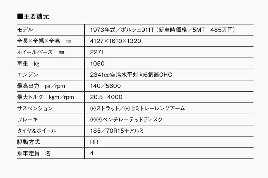 1973年式ポルシェ911T。1964年から73年までの初期型911はスレンダーなボディから「ナロー」と呼ばれる。標準モデルはT/E/Sの3グレード構成。エンジンは2.4リッターのフラットシックスを搭載
