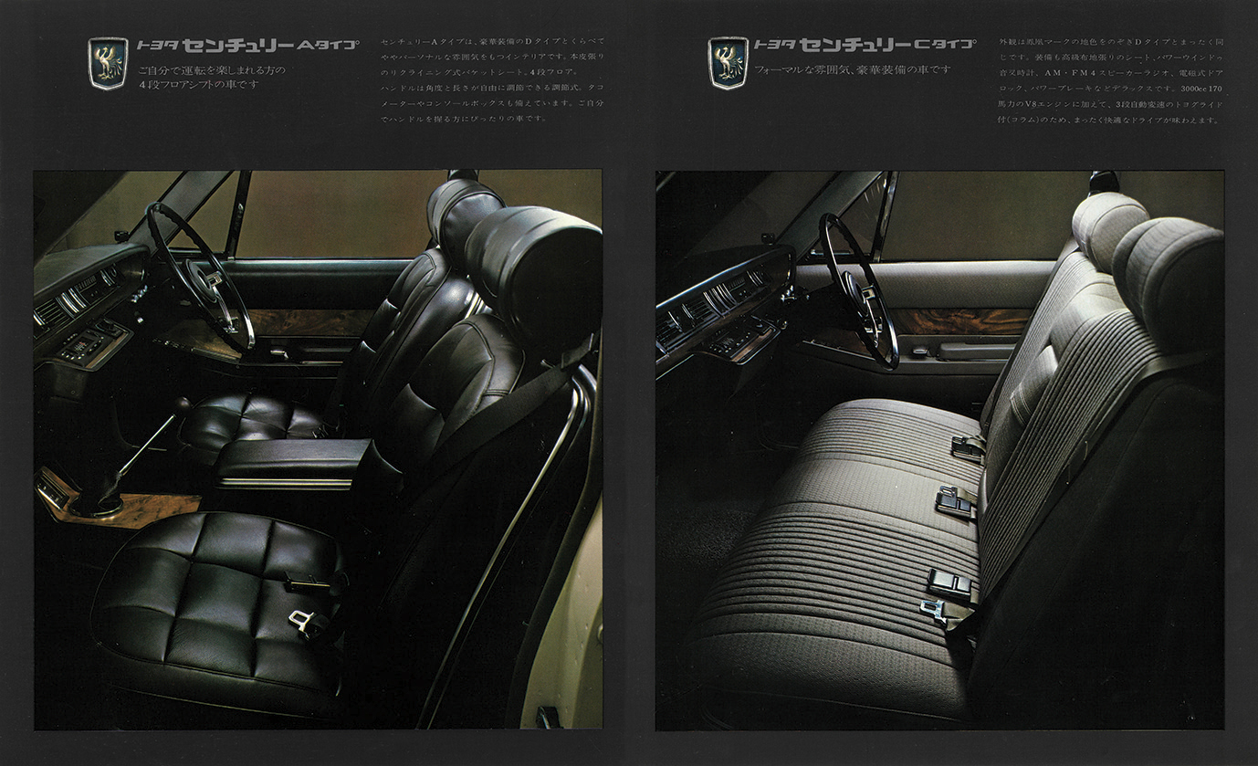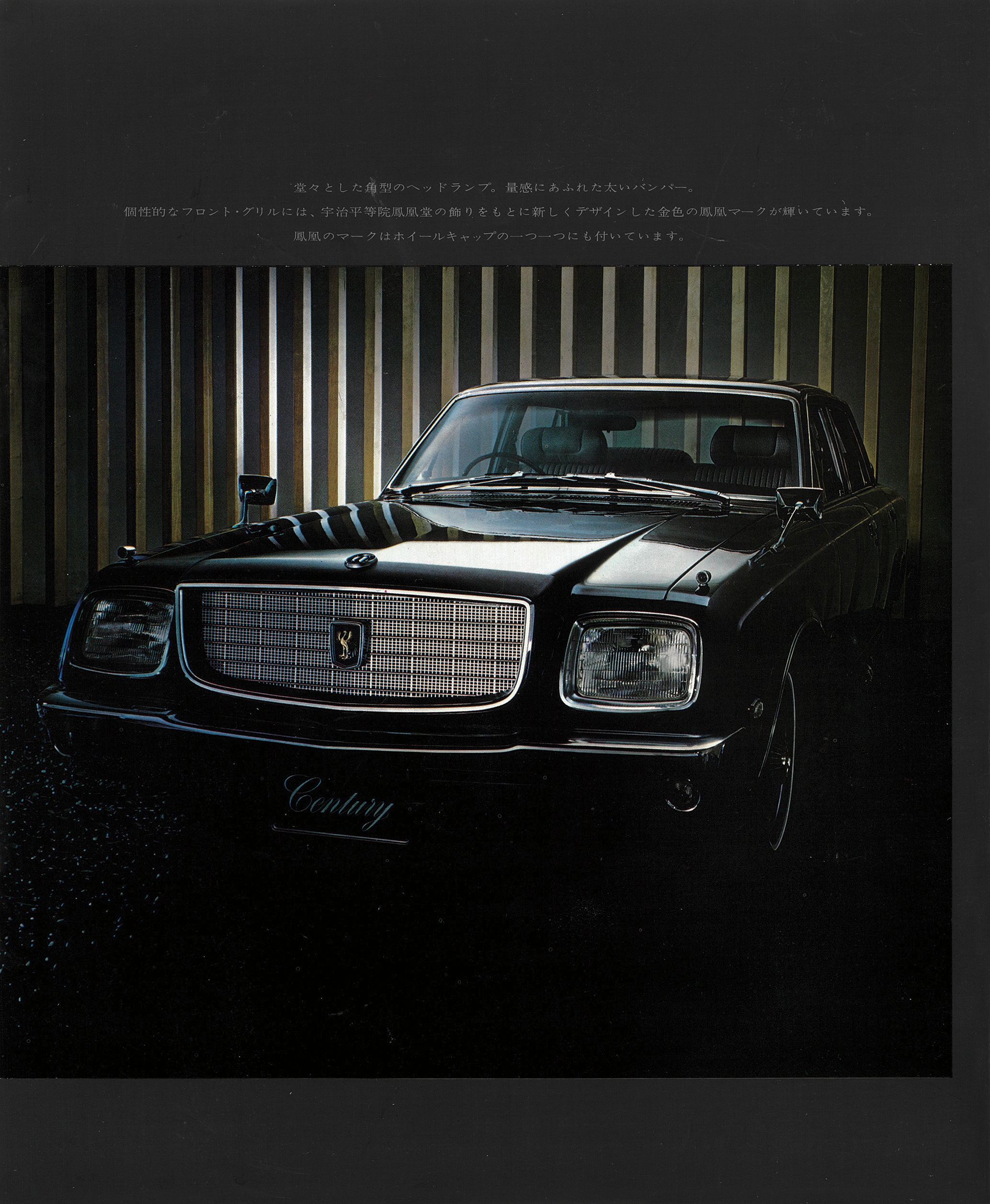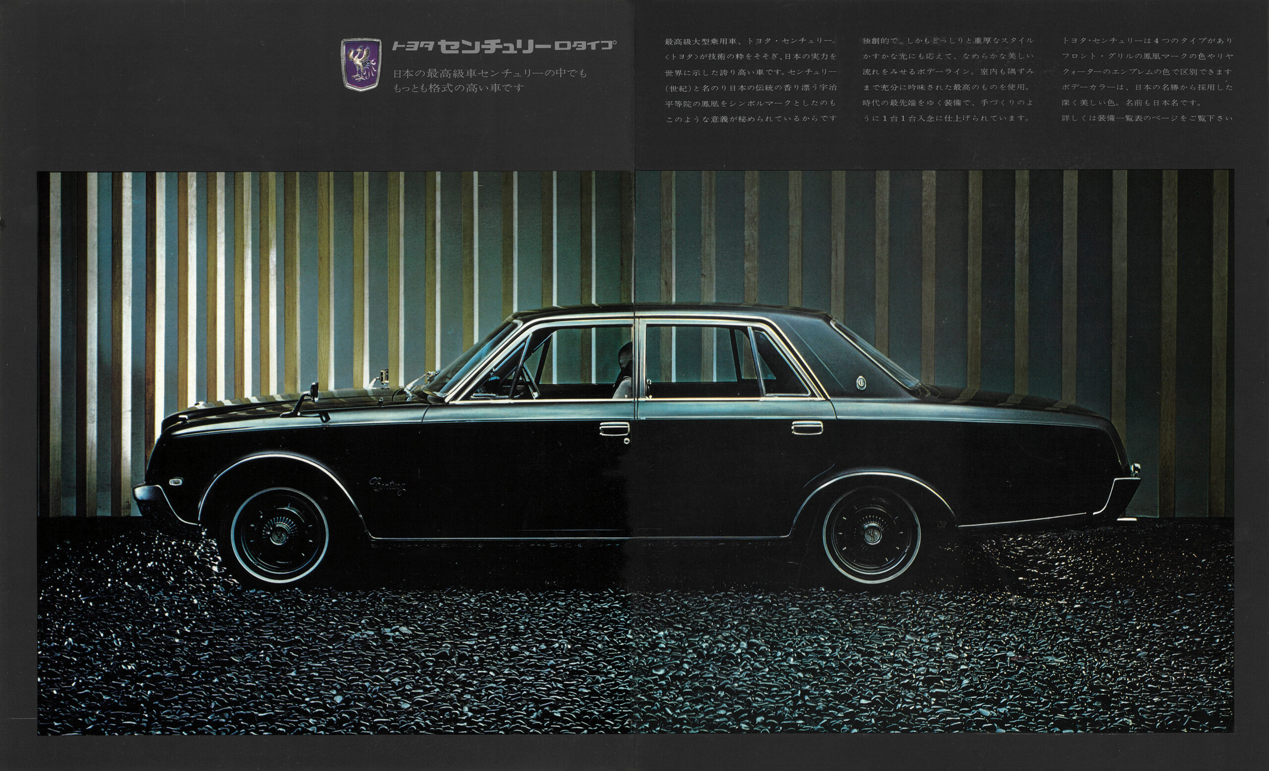 新たにトヨタの最上級に位置するブランドに発展した「センチュリー」の原点である初代の復刻版カタログ。カタログは1969年版(原寸298×245mm、20㌻編集)。センチュリーはトヨタ・グループの創始者である豊田左吉翁、生誕100周年と明治100年を記念したネーミング(=センチュリー)を冠して1967年に誕生したトヨタのフラッグシップ。初代&2代目クラウンと、センチュリーの前身となるクラウンエイトを手がけた中村健也氏が開発を主導した。欧米の高級車の模倣ではなく、「伝統的な日本の美」を追求したのが特徴で、エンブレムには宇治平等院の飾りをモチーフにした「鳳凰」を採用。ボディカラーの名称にも「フジ・ノーブルホワイト」「カムイ・エターナルブラック」「ウンゼン・ミスティグレー」など、和名が付けられていた。メカニズムは、当時の最先端。パワーユニットは3ℓ・V8(当初150ps/24kgm、1969年に170ps/25kgmに改良)。サスペンションは前後トレーリングアーム式で、フロントにはエアばねを組み合わせていた。パワーアシスト付きのステアリングも、リンケージの大半をエンジン上部に配置した独特の構造だった。ラインアップはD/A/G/Bの4タイプ。基本的にショーファードリブンというキャラクターだったが、Aタイプはオーナードライバー向けで、トランスミッションにはフロアタイプの4速MTを採用。前席をセパレート形状に仕上げていた。初代センチュリーは改良を重ねながら、1997年まで生産された。