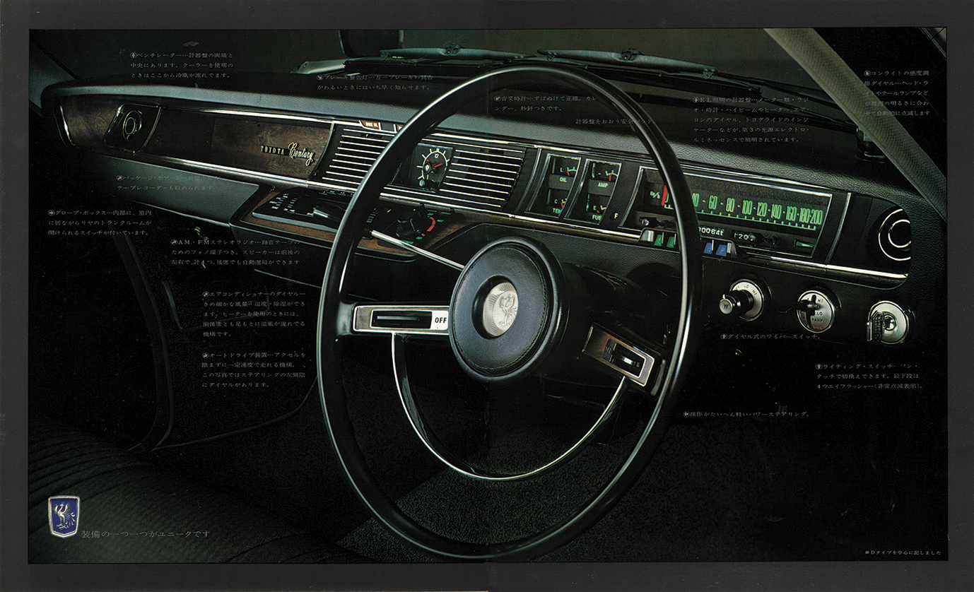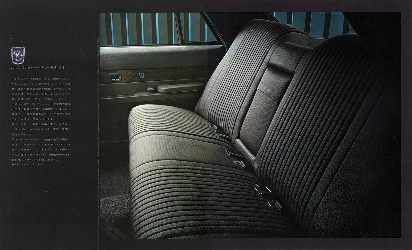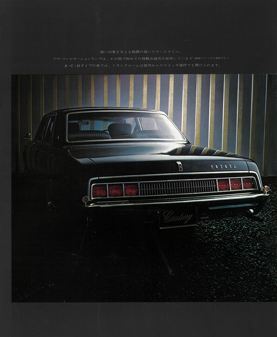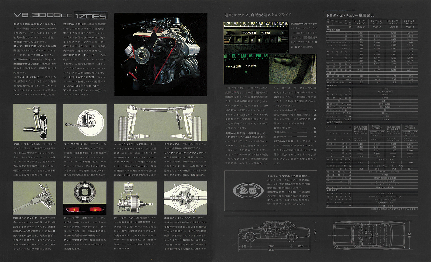 新たにトヨタの最上級に位置するブランドに発展した「センチュリー」の原点である初代の復刻版カタログ。カタログは1969年版(原寸298×245mm、20㌻編集)。センチュリーはトヨタ・グループの創始者である豊田左吉翁、生誕100周年と明治100年を記念したネーミング(=センチュリー)を冠して1967年に誕生したトヨタのフラッグシップ。初代&2代目クラウンと、センチュリーの前身となるクラウンエイトを手がけた中村健也氏が開発を主導した。欧米の高級車の模倣ではなく、「伝統的な日本の美」を追求したのが特徴で、エンブレムには宇治平等院の飾りをモチーフにした「鳳凰」を採用。ボディカラーの名称にも「フジ・ノーブルホワイト」「カムイ・エターナルブラック」「ウンゼン・ミスティグレー」など、和名が付けられていた。メカニズムは、当時の最先端。パワーユニットは3ℓ・V8(当初150ps/24kgm、1969年に170ps/25kgmに改良)。サスペンションは前後トレーリングアーム式で、フロントにはエアばねを組み合わせていた。パワーアシスト付きのステアリングも、リンケージの大半をエンジン上部に配置した独特の構造だった。ラインアップはD/A/G/Bの4タイプ。基本的にショーファードリブンというキャラクターだったが、Aタイプはオーナードライバー向けで、トランスミッションにはフロアタイプの4速MTを採用。前席をセパレート形状に仕上げていた。初代センチュリーは改良を重ねながら、1997年まで生産された。