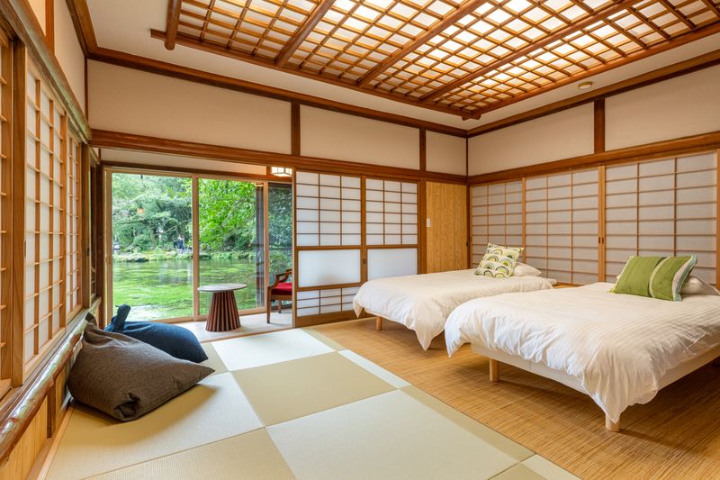 掬水は富士山本宮浅間大社に隣接するこだわりのお宿。仁寿3年(西暦853年)から現存し、客室は4室。一階の水の間の窓外には富士山の湧水から成る湧玉池がすぐ目の前に広がり、その清らかさを目と耳で体感できます。湧玉池は国の特別天然記念物に指定される平成の名水百選のひとつ。
