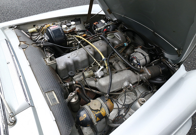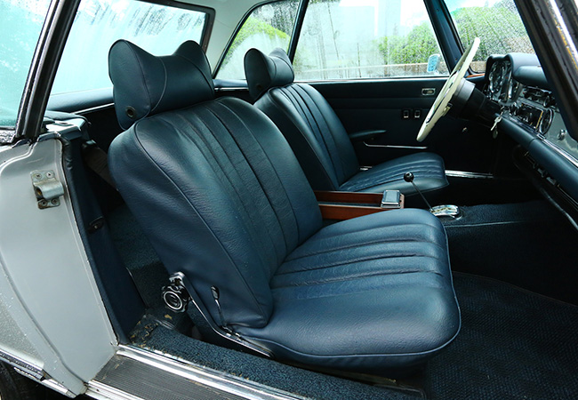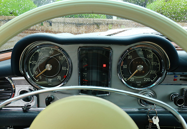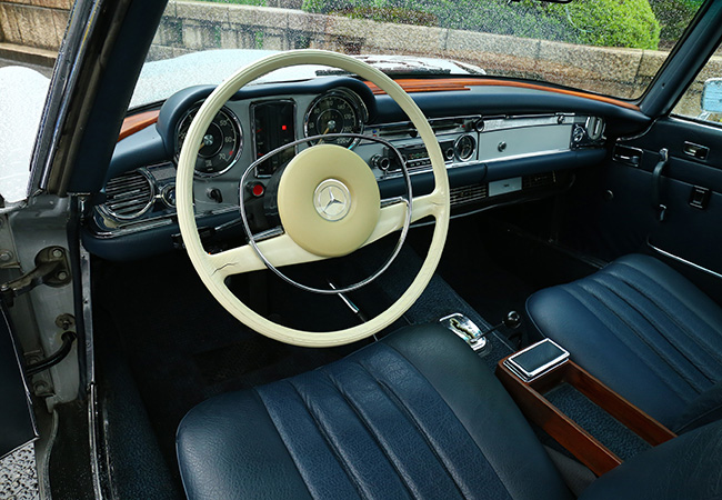 パワーユニットは年式で異なる。W113型は1963年に“230SL”としてデビュー。2.3リッター直列6気筒OHCは、ボッシュ製の6プランジャー燃料噴射装置を組み合わせ、150ps/20㎏mを発揮した。最高速度は200㎞/hである。1967年には250SLが誕生。250SLのM129型ユニット(150㎰/22㎏・m)は7個のメインベアリングを持つ新設計ストレートシックスで、格段にスムーズな走りを見せた。さらにブレーキが全輪ディスク式になり、燃料タンク容量が82リッターに拡大された点も話題だった。最終版となる280SLへの進化は1968年。M129型ユニットをさらに300㏄拡大した280SL用M130型は170㎰/24・5㎏・mを発揮。ファイナルギアレシオをやや低めたこともあり、加速性能が一段とシャープになった。ただしギア比の関係で最高速度は195㎞/hに下がっている。