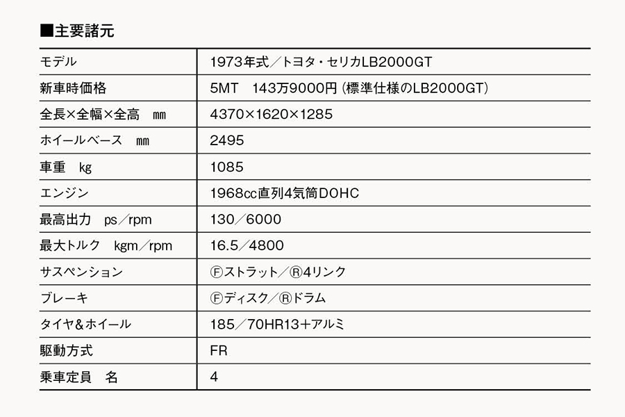 初代セリカは1973年4月、大型リアゲートを持つリフトバック(LB)をラインアップに加え、人気に拍車がかかる。中でもLBに新たに設定された2000GTは、パワフルな18R-G型2リッター直4DOHCユニット(145ps)を搭載。最高速度205km/hを誇り、トヨタのスポーツフラッグシップの座を確立した。