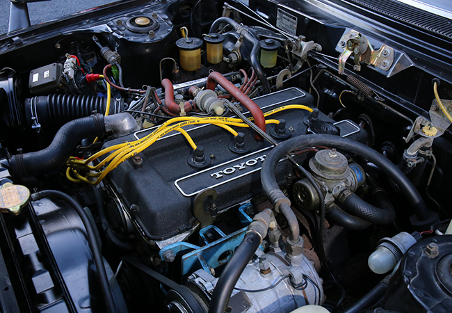 写真のブラックセリカは、385台のうち48番目に製造された車両。ボディの状態は良好である。塗装は、いまなお十分なツヤをキープしている。ボンネットや右ドア部などに小さなエクボ傷はあるものの、大きなへこみはなくサビは未発生。ウィンドウ回りのゴム類とドア部のシーリングもコンディション良好だった。ブラックセリカの専用アイテム(ボディ下部のGTストライプ、輸出仕様サイドプロテクションモール、製造ナンバーステッカー)はすべて健在。ホイールは、標準の13インチから14インチにアップした社外アルミを装着していた。