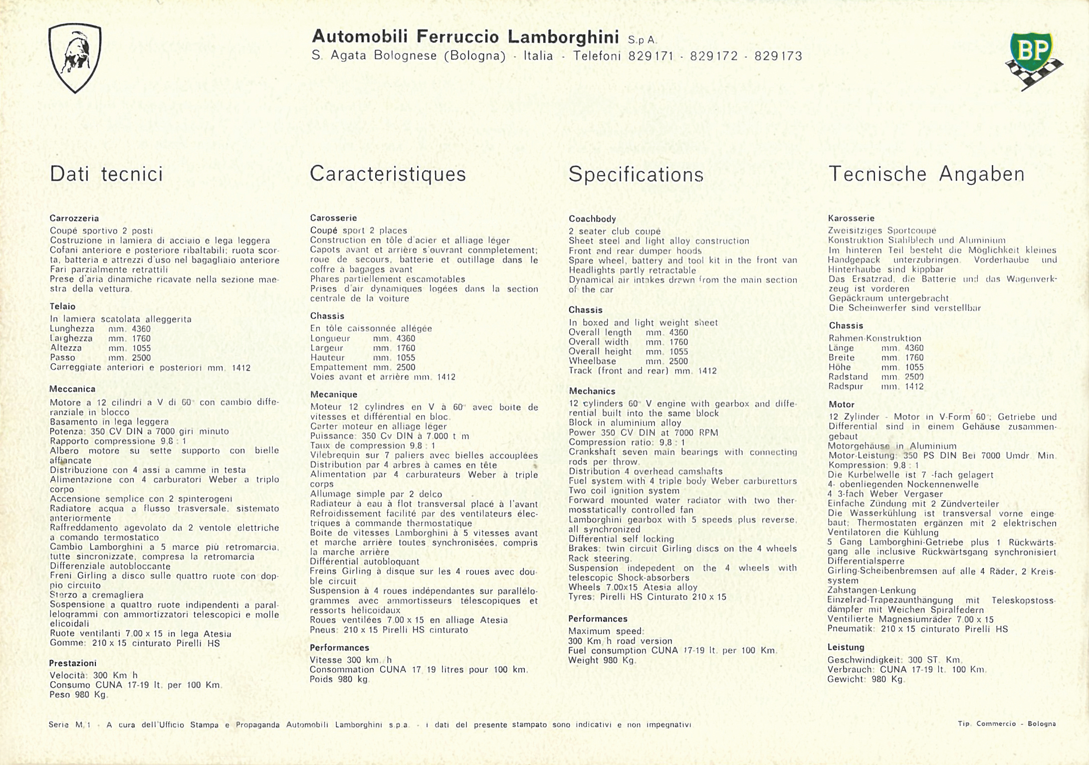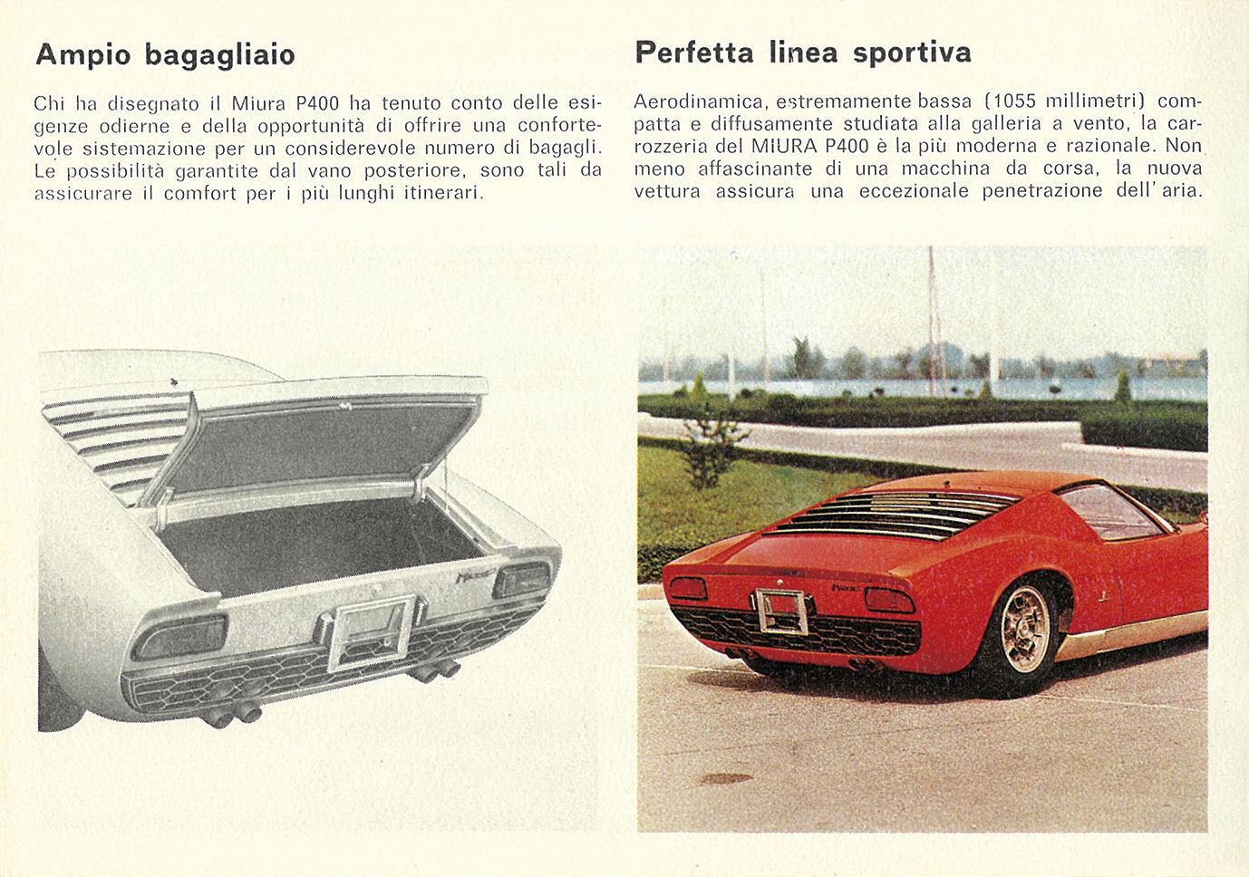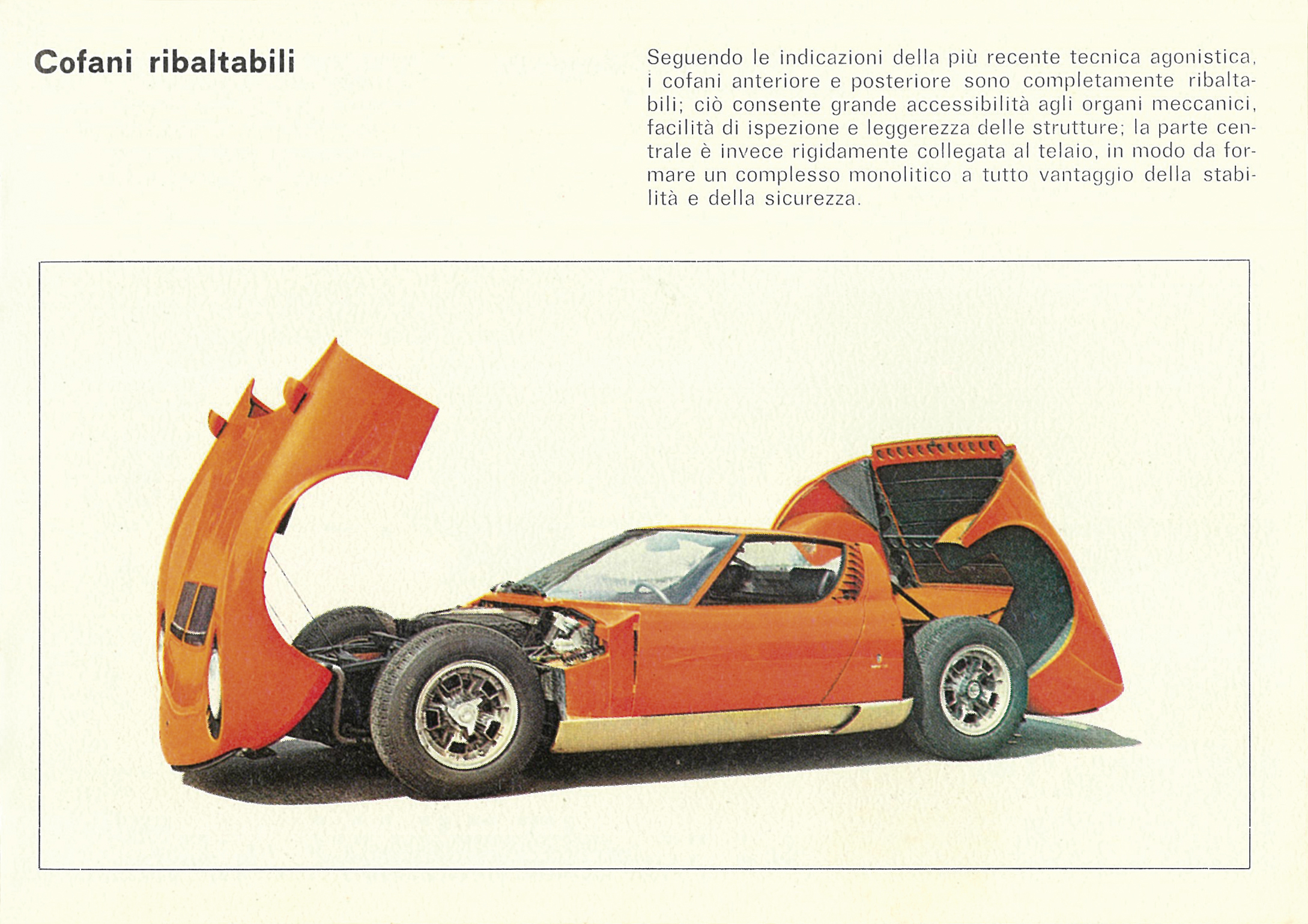ランボルギーニ初のMRスーパースポーツ、「ミウラP400」の復刻版カタログ。ミウラは1965年のトリノ・ショーにシャシーのみのプロトタイプ「TP400」を出展。翌年の1966年ジュネーブ・ショーでボディを纏ったプロトタイプを披露し、1967年からミウラP400として市販を開始した。ミウラはキャビン背後に4リッターV12ユニットを横置き搭載。従来FR方式が一般的だったスーパースポーツの世界に、前後重量配分に優れたMRレイアウトを提案した先駆けとなった。流麗なデザインは。当時カロッツェリア・ベルトーネの主任デザイナーだったマルチェロ・ガンディーニが手がけている。パフォーマンスは秀逸。4リッタ―V12は350cv/7000rpmを発揮し、トップスピードは300km/hに達すると公表された。ただし超高速域や、限界時の特性はナーバスな面があったようだ。ボディサイズは4360×1760×1055mm。ミウラは1968年末にP400S、1971年3月にはP400SVに発展しポテンシャルをアップ。1973年までシリーズ合計で約750台が生産された。カタログは1967年版(原寸196×278mm、8㌻編集)。