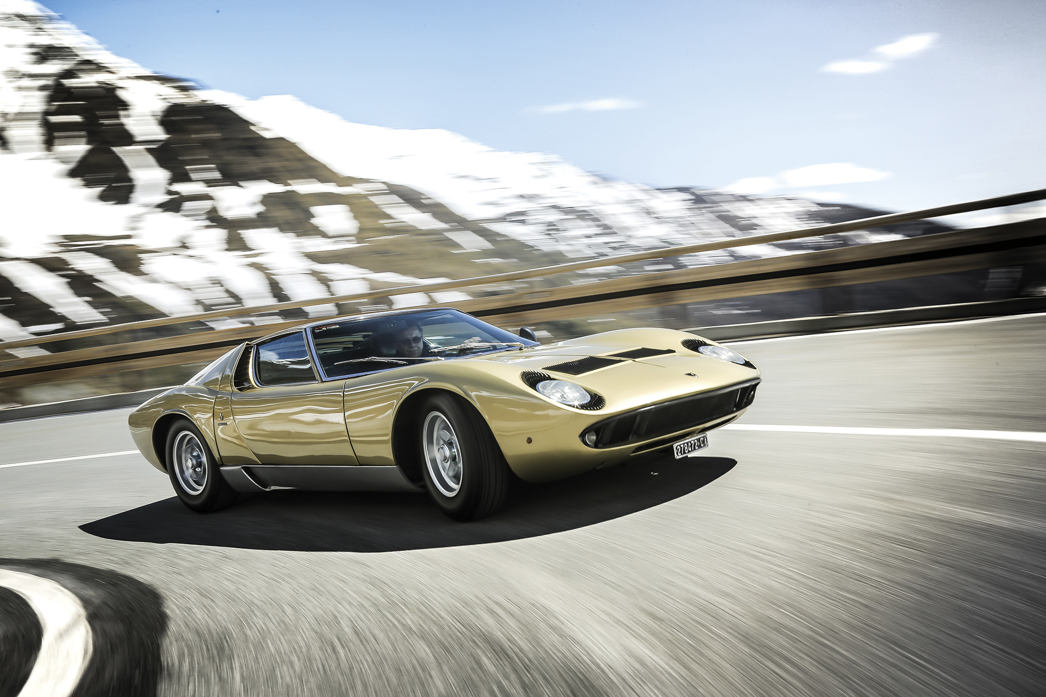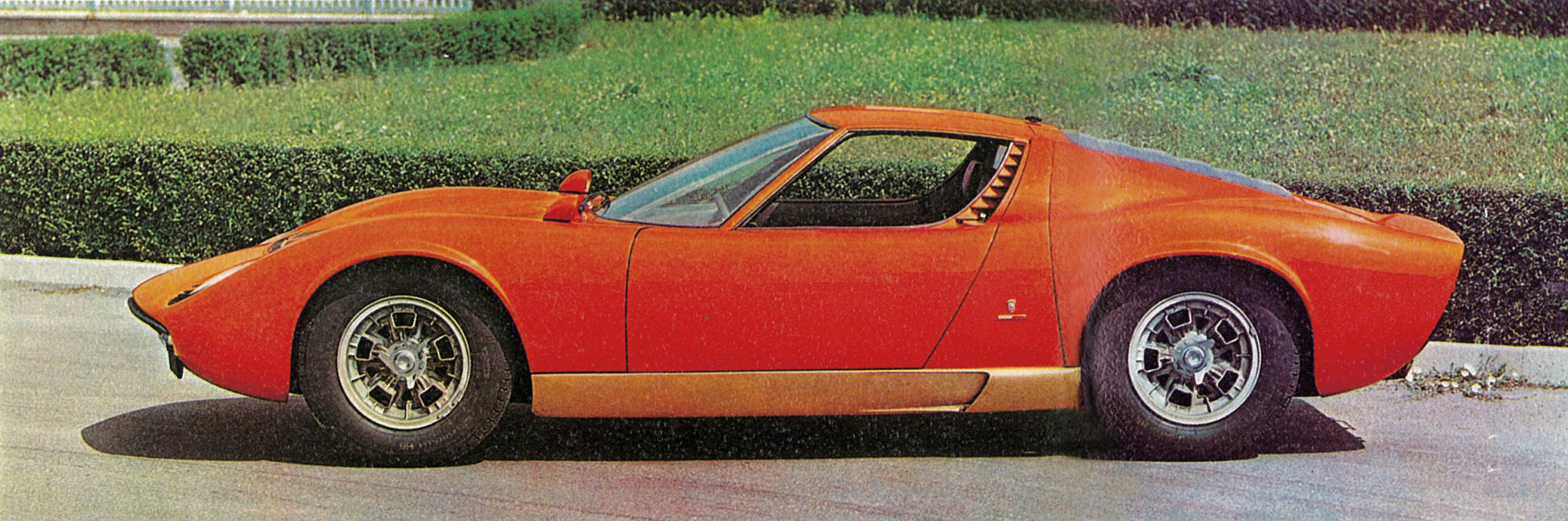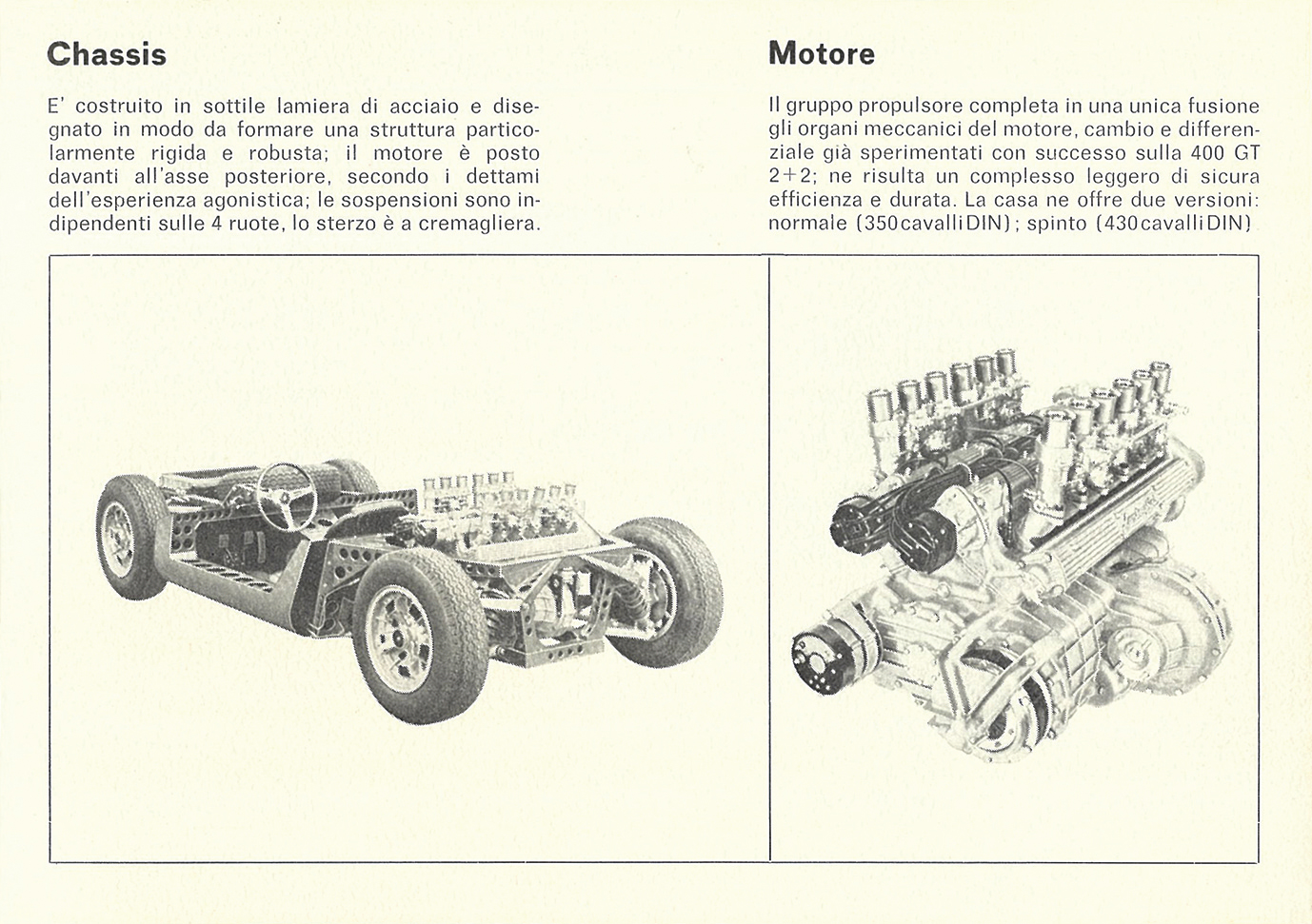 ランボルギーニ初のMRスーパースポーツ、「ミウラP400」の復刻版カタログ。ミウラは1965年のトリノ・ショーにシャシーのみのプロトタイプ「TP400」を出展。翌年の1966年ジュネーブ・ショーでボディを纏ったプロトタイプを披露し、1967年からミウラP400として市販を開始した。ミウラはキャビン背後に4リッターV12ユニットを横置き搭載。従来FR方式が一般的だったスーパースポーツの世界に、前後重量配分に優れたMRレイアウトを提案した先駆けとなった。流麗なデザインは。当時カロッツェリア・ベルトーネの主任デザイナーだったマルチェロ・ガンディーニが手がけている。パフォーマンスは秀逸。4リッタ―V12は350cv/7000rpmを発揮し、トップスピードは300km/hに達すると公表された。ただし超高速域や、限界時の特性はナーバスな面があったようだ。ボディサイズは4360×1760×1055mm。ミウラは1968年末にP400S、1971年3月にはP400SVに発展しポテンシャルをアップ。1973年までシリーズ合計で約750台が生産された。カタログは1967年版(原寸196×278mm、8㌻編集)。