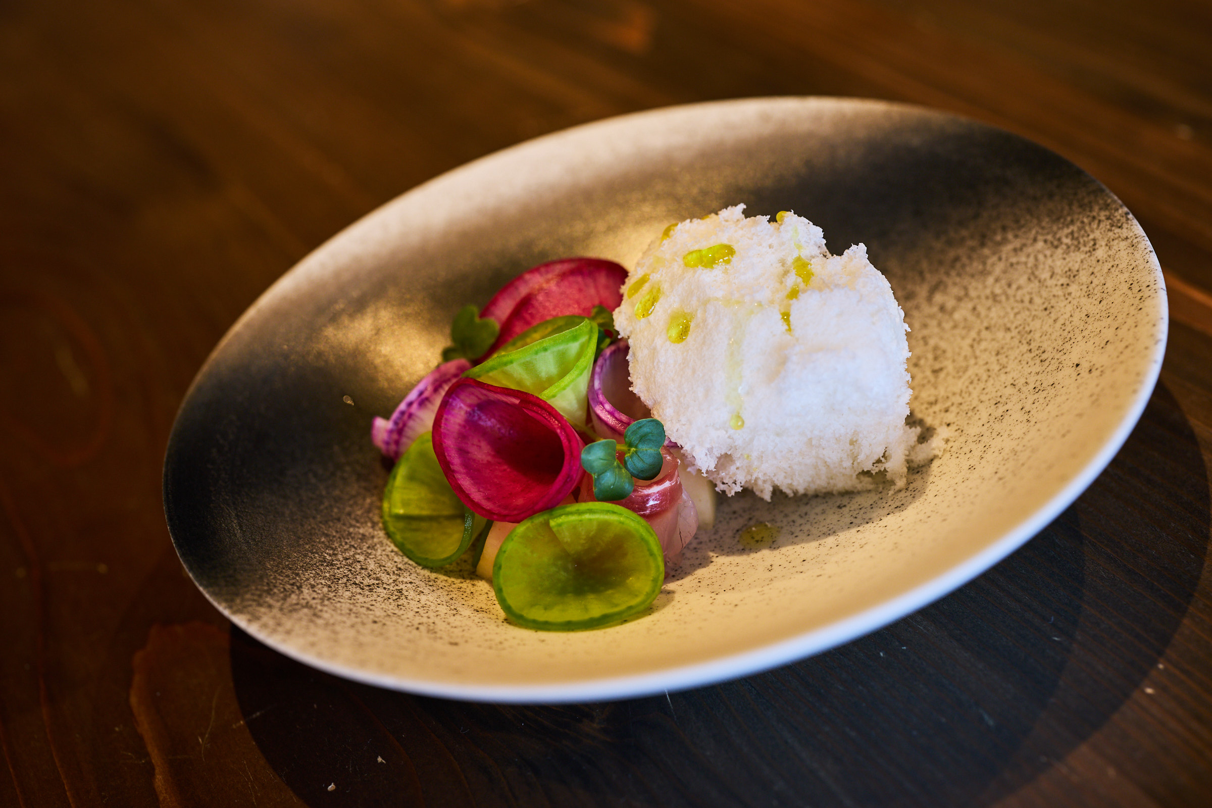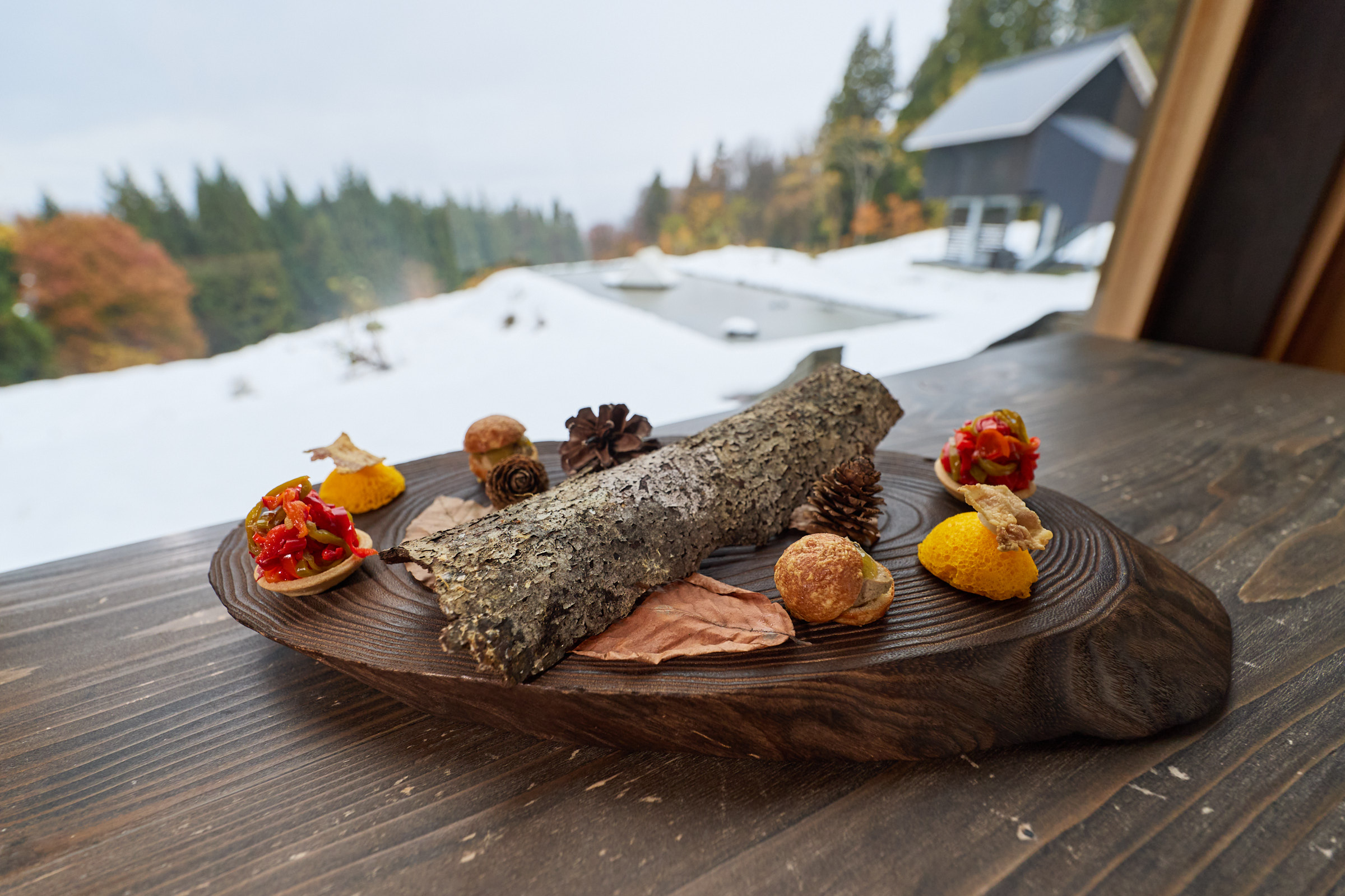 越後湯沢の北方に位置する十日町の山中にある小さなオーベルジュ“醸す森”。食事込みの宿泊客がメインとなるが、料理だけで訪れるファンも多い。醸す森”の看板シェフ栗山氏の料理は創造的かつ繊細。写真下はコース(1万5000円~)で、前菜の“アミューズブーシュ”、“大根の雪仕立て”、上写真がメインの“いのししのロースト”。一日1組限定の2階建てのヴィラも大人気。温泉“縄文の湯”も用意されている。都会の生活に疲れた旅人の心を癒し、お腹を満たす宿である。