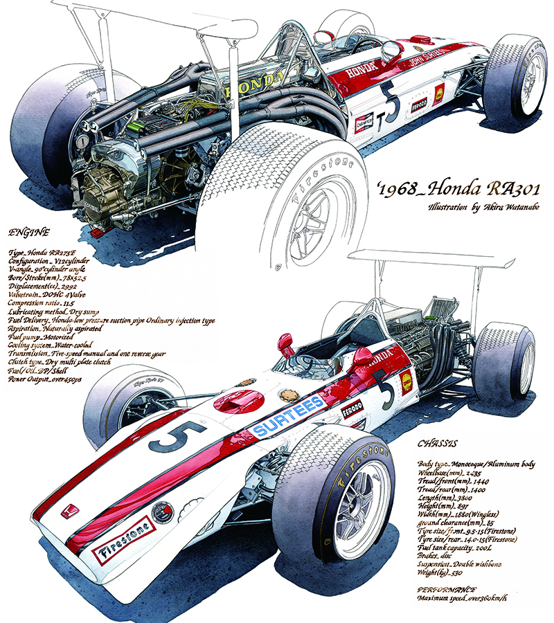 ③『RA301』は、フォーミュラカーでエンジンが露出しているタイプです。この作品は、ホンダコレクションホール(栃木県、モビリティリゾートもてぎ)で撮影した写真から描き起こしました。 実際に作品制作に取りかかると、細かいパーツ類を描くのはとても難しく、時間がかかる大変な作業でした。それでも、取材時に試乗させていただいたときの痺れるようなサウンドや、オーナーのお人柄などを思い出しながら下図をおこしていると、ついつい細密描写になってしまいました。 これもエンジンの魅力によるところが大きいです。