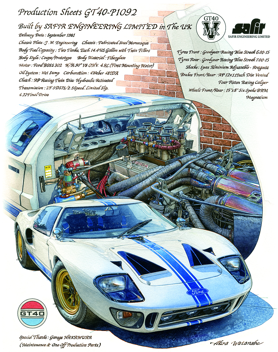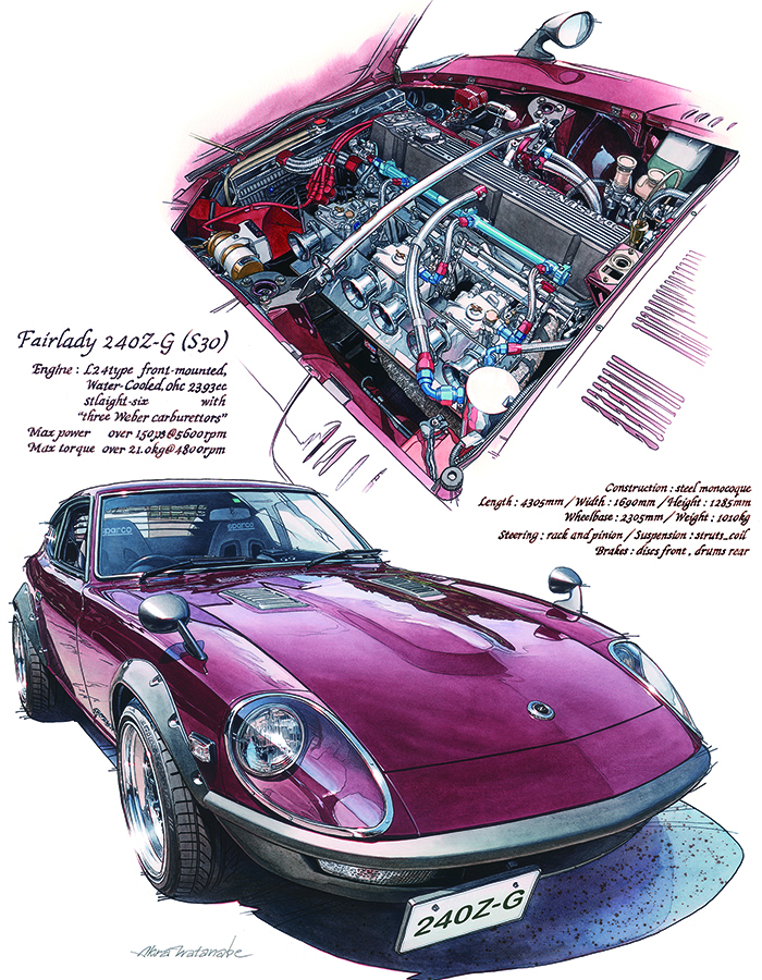 ①『240ZG』と、②『GT-40』は、オーナーからの依頼制作でしたので、見たい部分も多方向から確認することができました。取材撮影も好天に恵まれ、オーナーのこだわりや愛車のエピソードなどもうかがえて、とても楽しく撮影することができました。 撮影終了の時点で、絵の構図は、頭の中で8割方決まっていました。