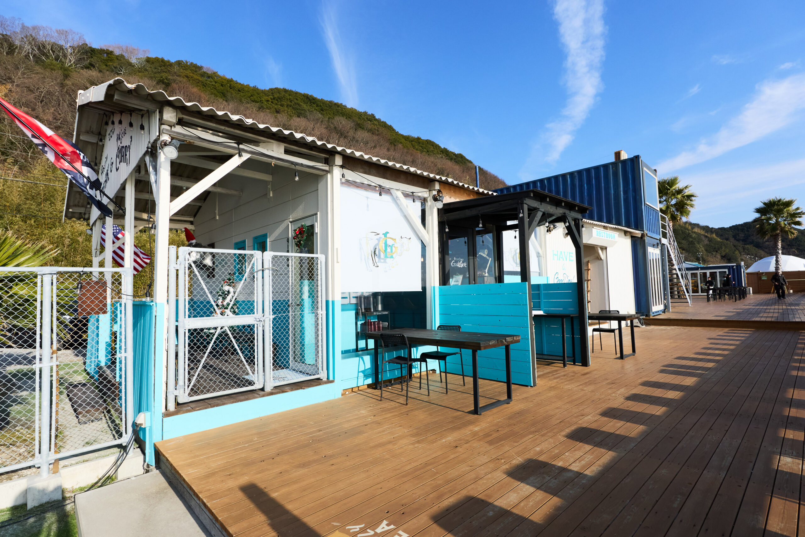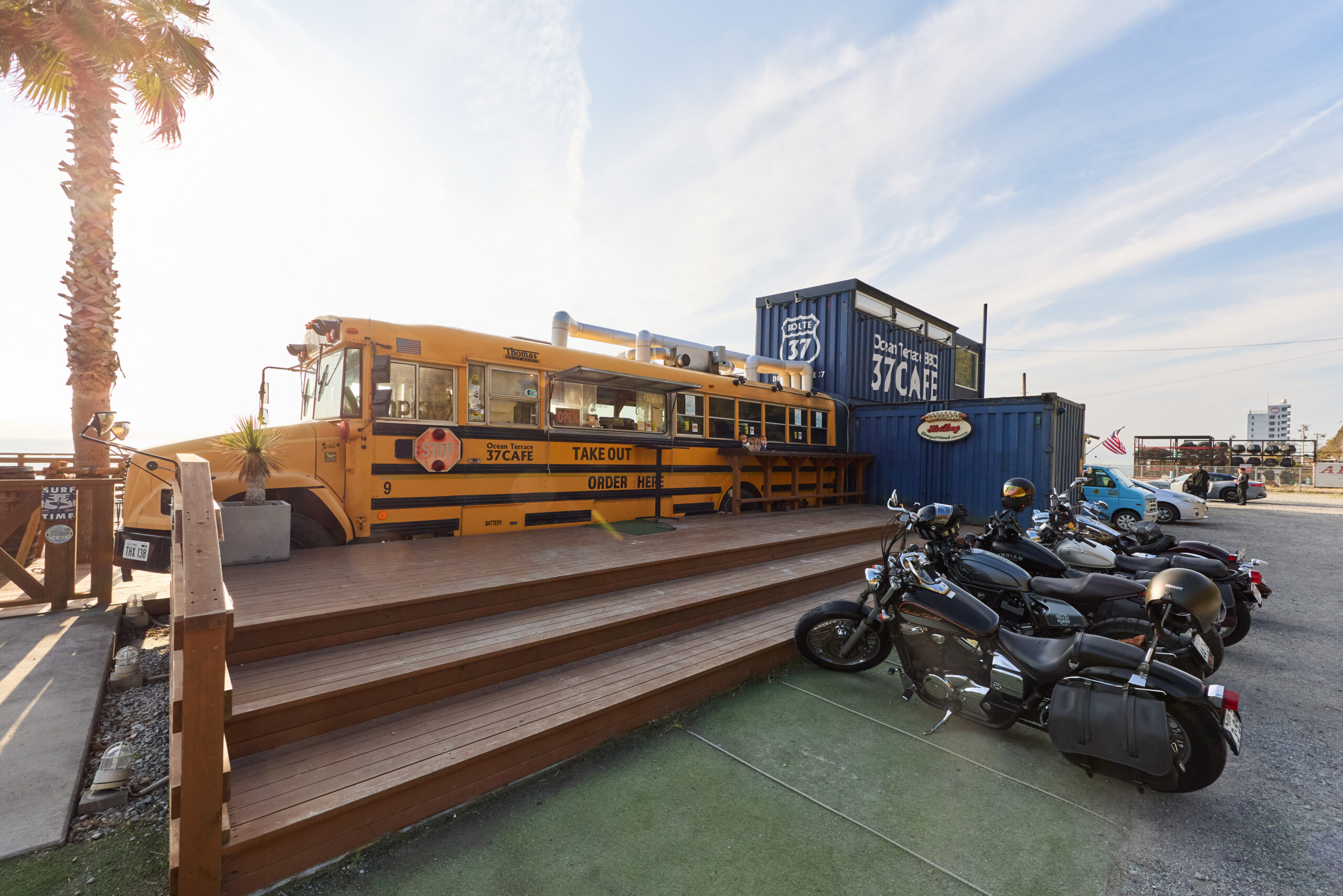 カフェとレストランが揃うDRIVE IN ROUTE 37。特筆すべきは海まで0mを歌うデッキ・テラス!伊勢の海を眺めながら様々なアメリカンフードを楽しめる。アメリカの古いスクールバスを利用した調理場や、周りに併設された様々なショップでまるでサンタモニカビーチにいるような気分に。バイカーにも人気の施設だ。