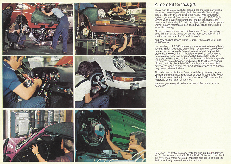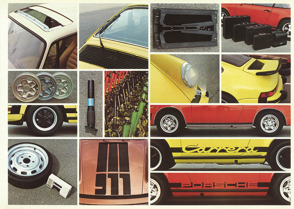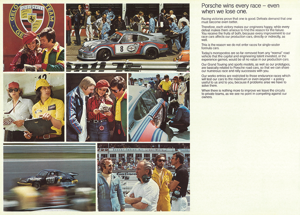 マニアを魅了し続ける永遠のスポーツカー「ポルシェ911」の復刻版カタログ。カタログは1974年に登場し1989年まで生産された930型。その初期モデルを、ドイツ・シュツットガルト本社の様子を交えながら紹介している。ちなみに930型は60年以上の歴史を誇る911の“空冷・第2世代”。1974年モデルは、特別な存在のRS3.0を除き、全車の排気量が2.4リッターから2.7リッターに拡大し、前後バンパーを大型化したのが特徴。内装もハイバック形状のシートを採用するなどモダンに進化した。ラインアップは911/911S/911カレラ/カレラ3.0(限定車)で構成。カレラ系を除き、ボディタイプはクーペとタルガから選べた。主力グレードは175hpのフラットシックスを搭載した911S。トップスピードは225km/hに達し、0→100km/h加速は7.6秒で駆け抜けた。930シリーズは、1975年秋に911ターボを加え、1978年には標準シリーズのエンジンを3リッターに拡大。1984年さらに3.2リッターに発展し、栄光のネーミング「カレラ」が復活する。930型は、ポルシェ、そして911の名声を一段と高めた実力車だった。カタログは1974年版(原寸250×355mm、36㌻編集)。