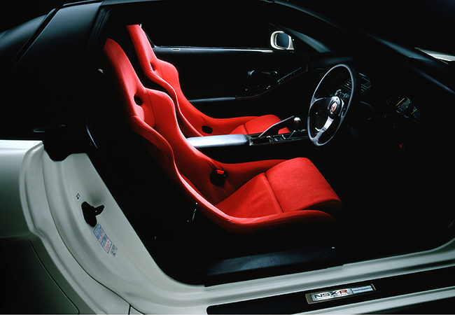 ドアを開けるとNSX-Rのキャラクターはひと目でわかる。鮮やかな赤のレカロ製フルバケットシート、MOMO製本革巻きステアリング、チタン削り出しシフトノブなどが、一瞬のうちにこのクルマの熱いキャラクターを伝えてくる。