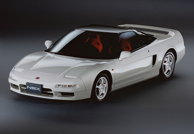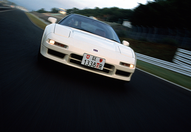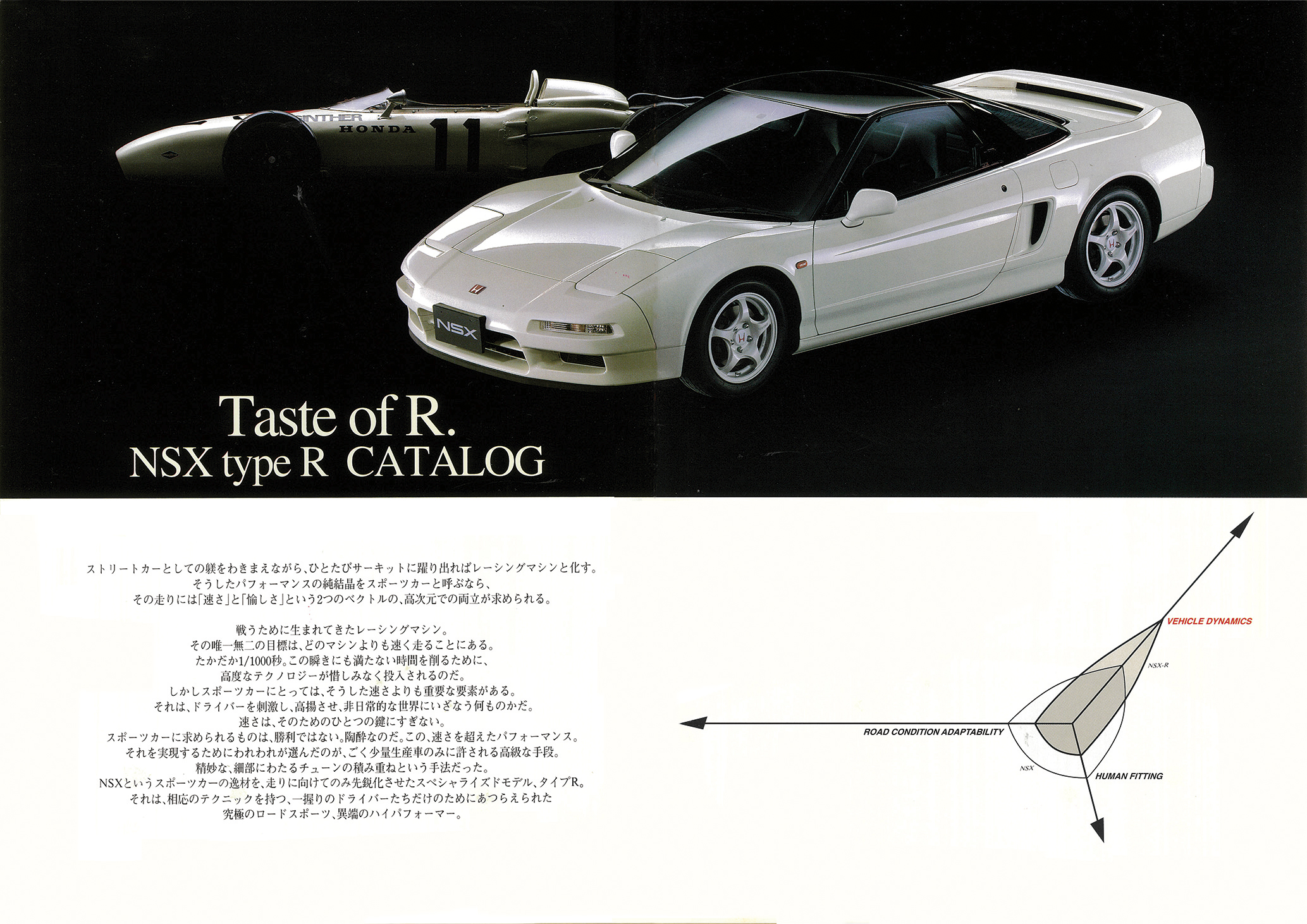 ホンダNSX-R(E-NA1型)。NSX-Rは「ピュアスポーツ」を標榜して1992年11月に発表。カタログでは「相応のテクニックを持つ、ひと握りのドライバーのためにあつらえた究極のロードスポーツ、異端のハイパフォーマー」と表現した。レーシーな走りは徹底した軽量化と、エンジンの高精度化、そして足回りのセッティング変更で実現