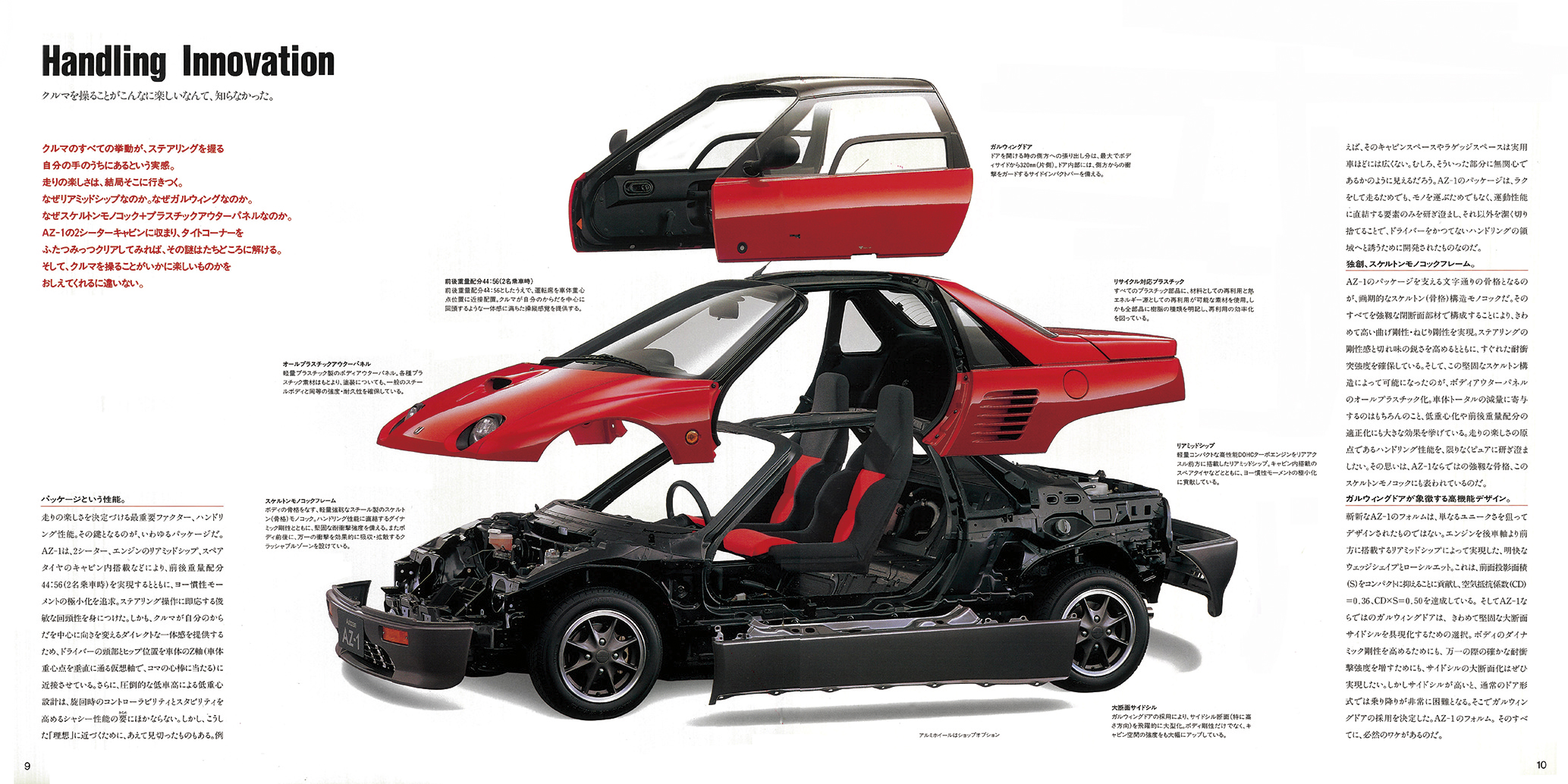 AZ-1はボディ外板を交換できるユニークな構造だ。スケルトンモノコックの上にかぶせる別のスキンを用意し。ファッションショーのモデルのように一日に何回も違うスタイルで現れたら、今度はTV局まですっ飛んでくるかもしれない……。とにかくAZ-1の小さな姿からは、次々と楽しいシーンが浮かび上がってくる。