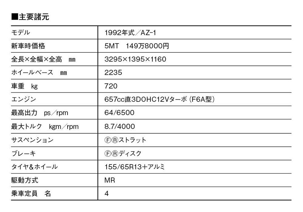 MAZDAオートザムAZ-1(E-PG6SA型)。AZ-1は1992年10月に登場したガルウイングMRスポーツ。Kカー規格ながらDOHC12Vターボ、大断面サイドシルを持つスケルトン・モノコックフレール、4輪ストラット式サスペンションなど、すべてが最高の走りを目指していた。独自のボディ構造で、手軽にボディ外板が変更できる点も魅力だった。パワートレーンはスズキが供給
