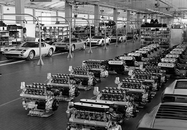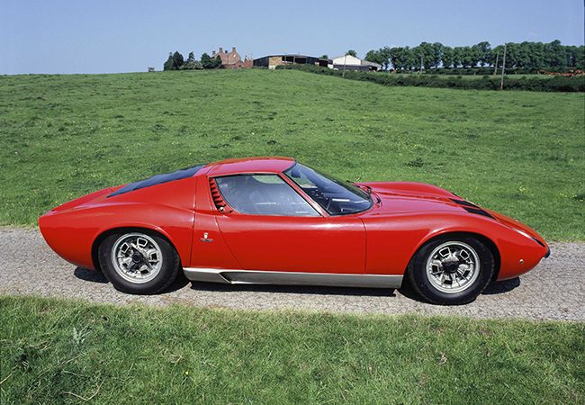 ミウラはランボルギーニ初のミッドシップV12スポーツとして1966年3月のジュネーブ・ショーでワールドプレミアを飾り、1973年まで759台を生産。開発責任&シャシー設計はジャンパオロ・ダラーラ。彼はジオット・ビッザリーニが手がけた4リッター・V12ユニットをキャビン背後に横置き搭載。革新的なMRロードカーを生み出した