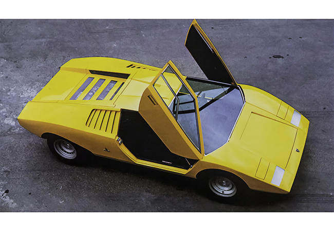 スタイリストはまたしてもガンディーニ。ミウラのデザインを自ら古臭いと思っていた彼は、スタンツァーニの革新的レイアウトに「そうでなければならない」モダンな、というかほとんど未来的な外皮をまとわせ、中身の革新性にふさわしいアピアランスを実現した。今なお未来的なカウンタックのスタイルは、かのシザーズドアを筆頭に、「奇跡の必然」でもあった。