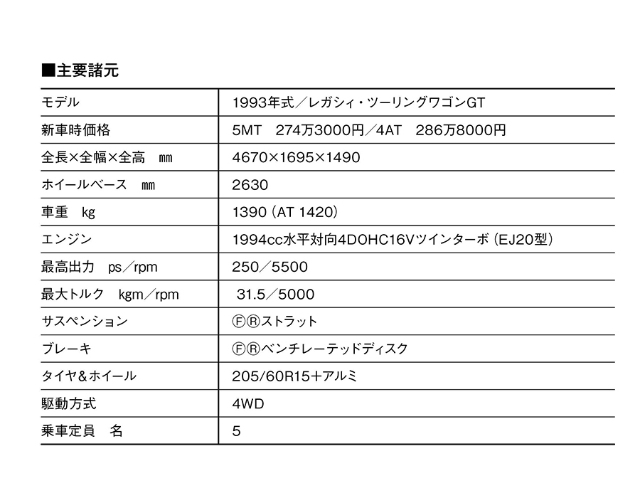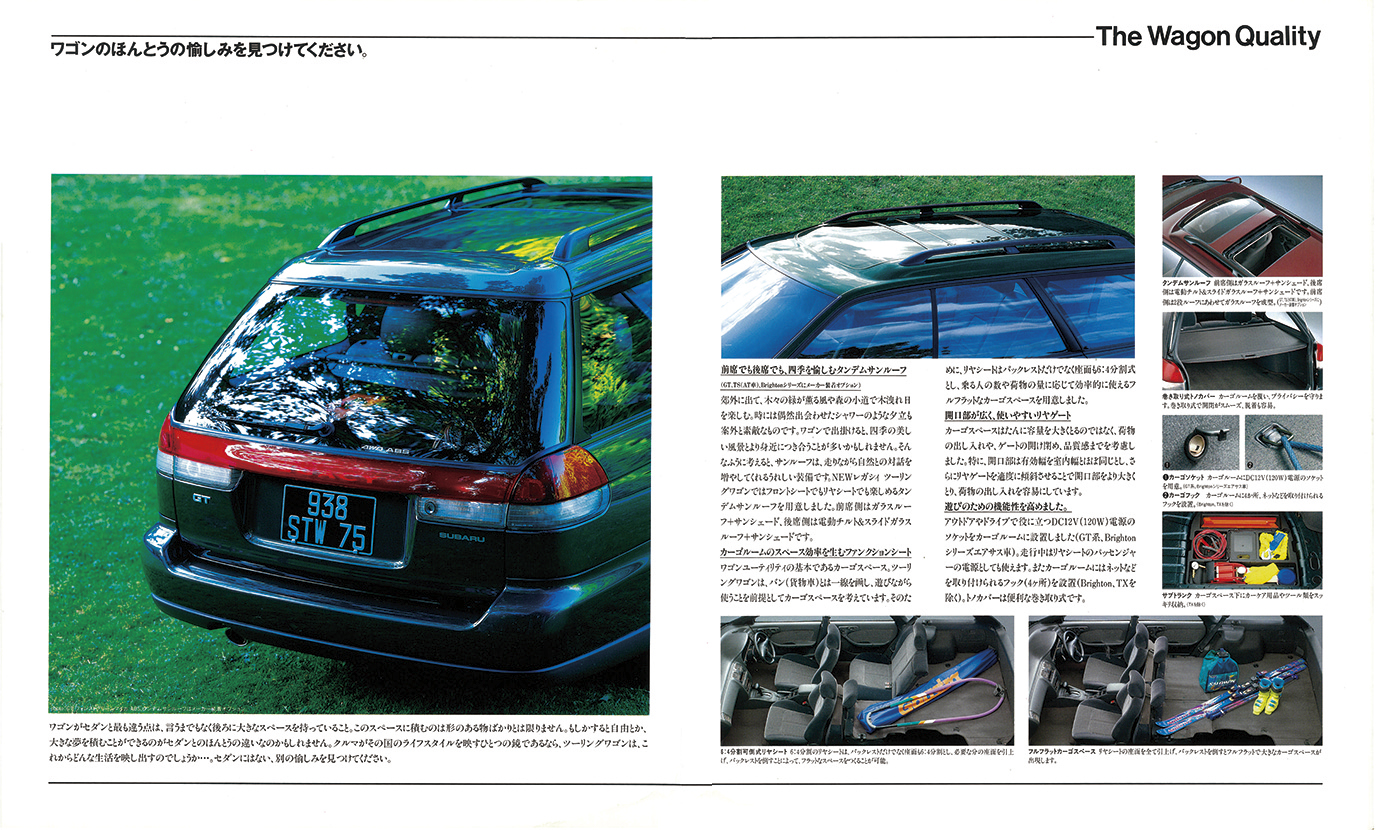 2代目レガシィは1993年10月に登場。高い人気を博した初代のコンセプトを継承し、すべてがグレードアップした自信作だった。販売主力のツーリングワゴンは「走ることの愉しさや日常生活にはちょっと贅沢なくらいの機能や装備を持った旅のクルマ=グランドツーリングカー。自由という、かけがえのないプレステージを手に入れることができる、あなたのファーストカーです」と魅力を語りかけた