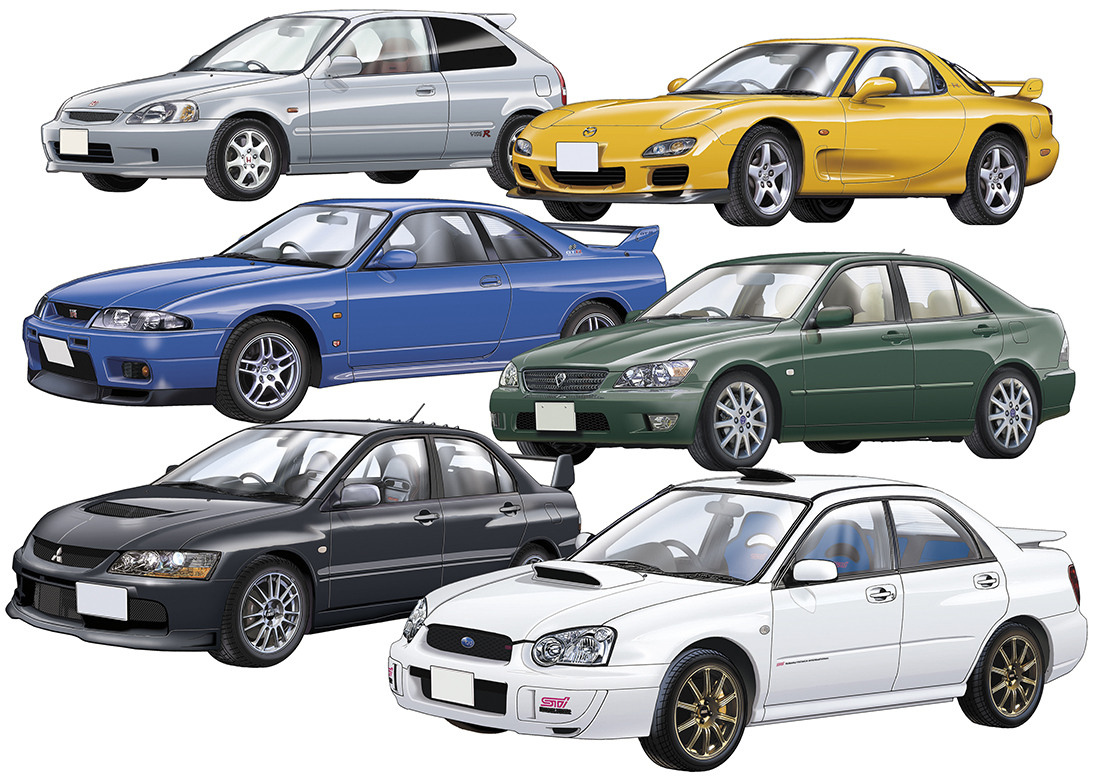 作品②『トミカリミテッドヴィンテージ』パッケージイラスト(デジタル ペインティング)/左の列は上から1999年ホンダ・シビック タイプR/1996年日産スカイラインGT-R・Vスペック/2006年三菱ランサー・エボリューションⅨ・MR・GSR。右列は上から2001年マツダ RX-7タイプR/2002年トヨタ・アルテッツアRS200/2003年スバル・インプレッサWRX STi サイズ:縦×横210×297㎜(解像度350dpi) 制作:2024〜2025年