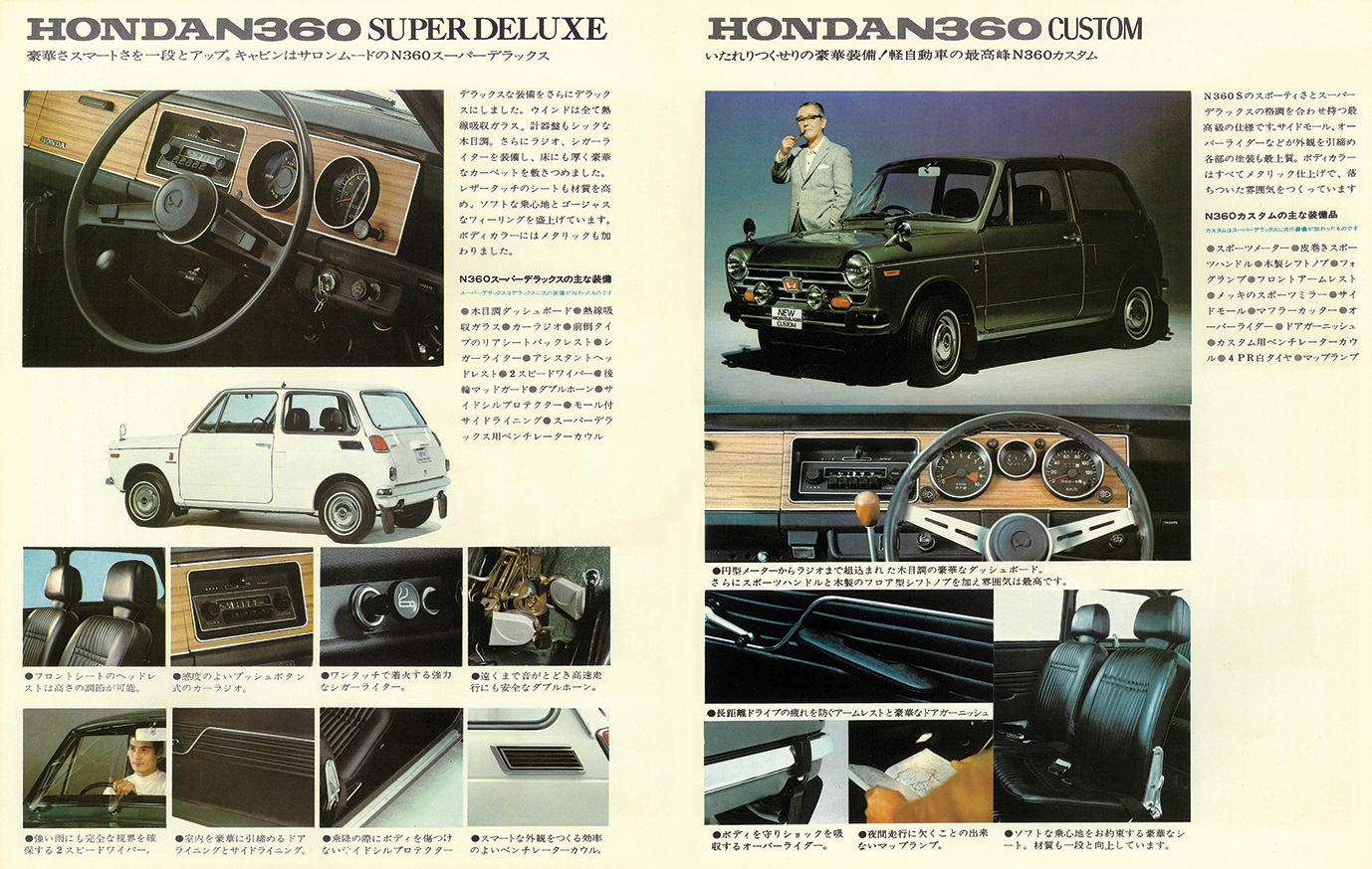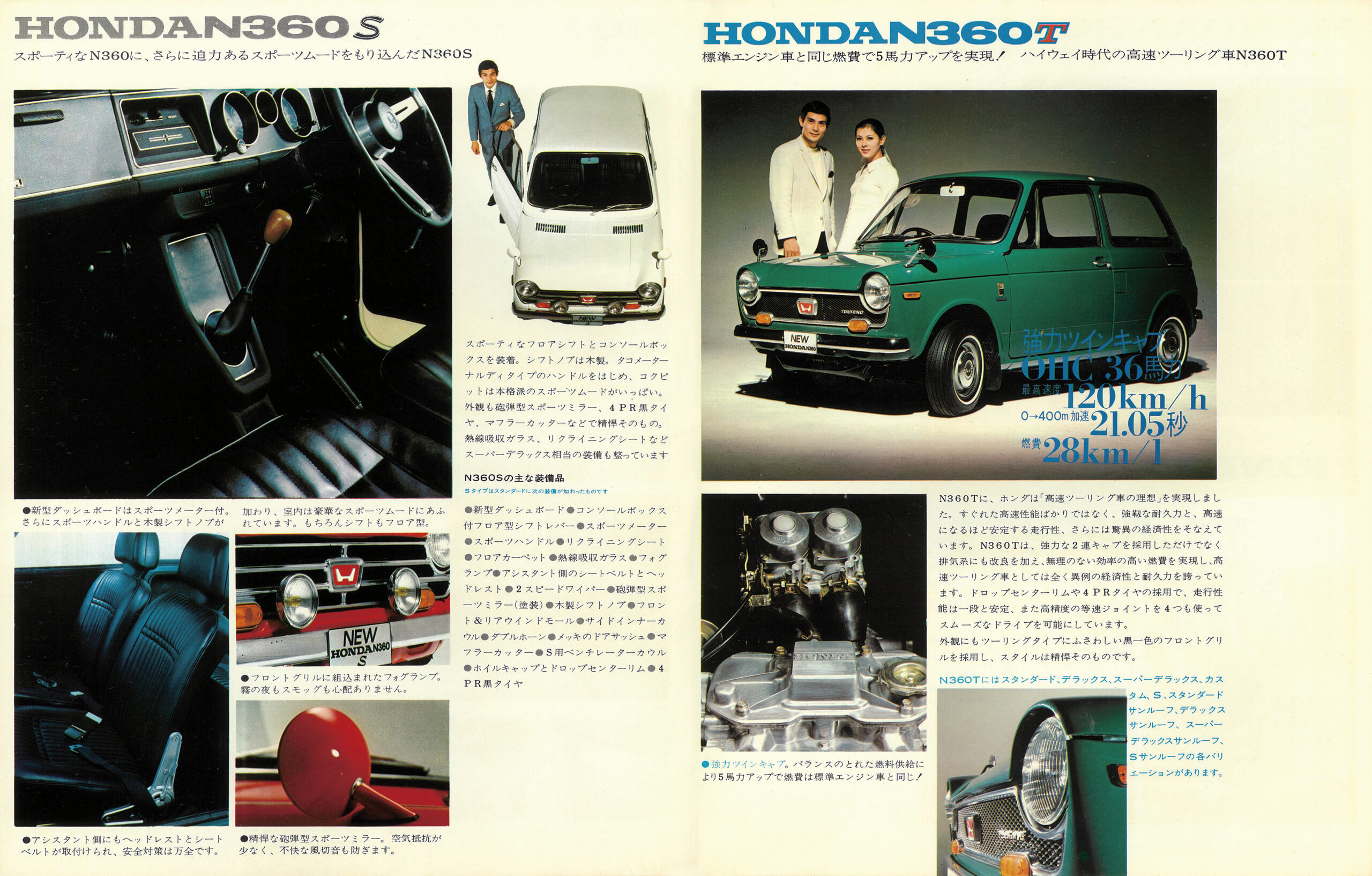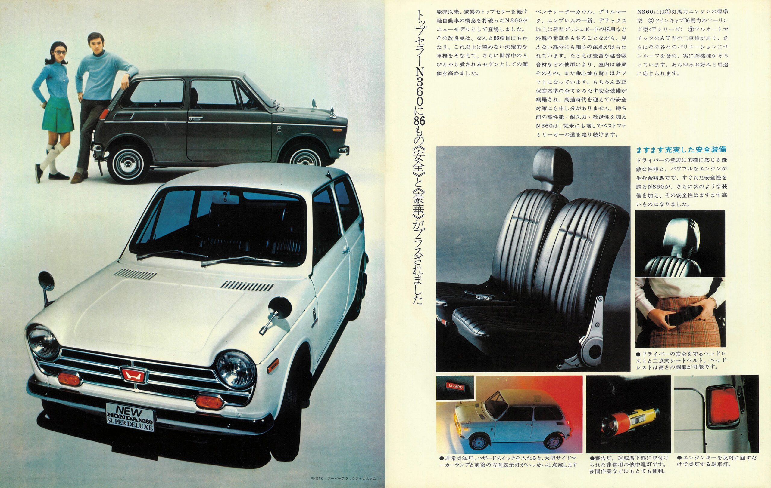 カタログは通称“N-II“と呼ばれる1969年1月に登場した大幅改良版。当初モデルと比較して86ものリファインが加えられ、ラインアップはスタンダード/DX/スーパーD X/カスタム/Sのワイド構成に成長。31psのシングルキャブ仕様に加え、36psのツインキャブ仕様“Tシリーズ”や、4速AT仕様、サンルーフ仕様も選べた。