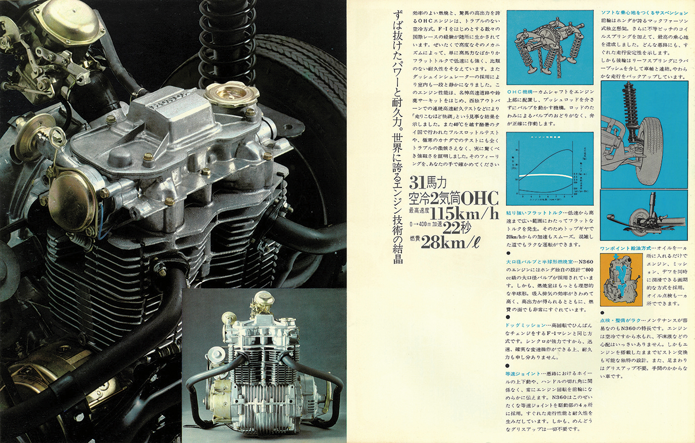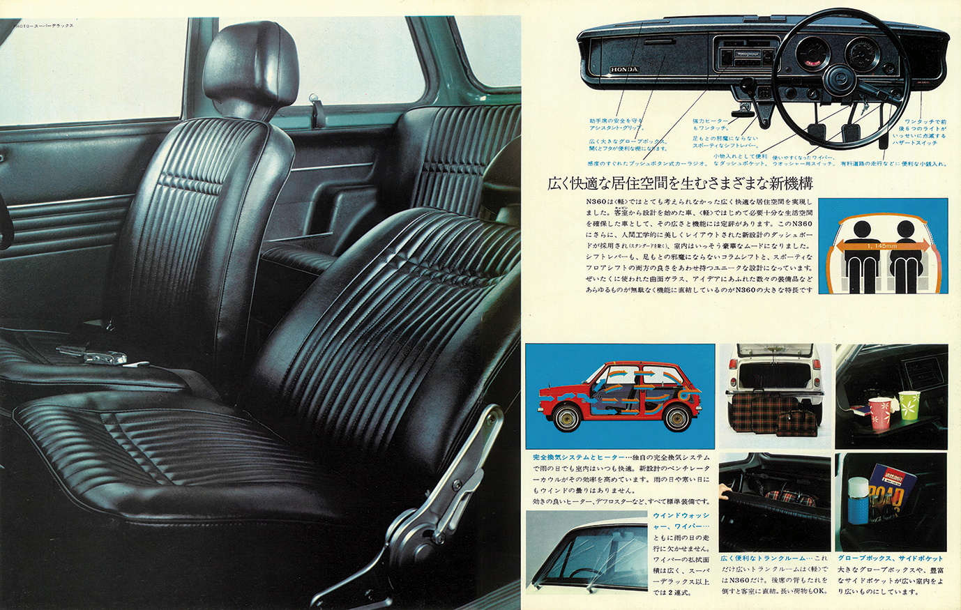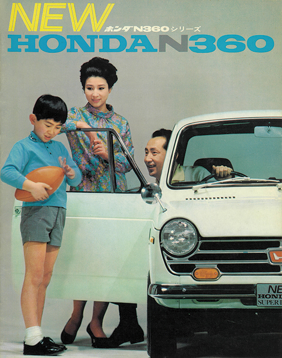 1969年モデルのホンダN360の復刻版カタログ(原寸280×220mm、16㌻編集)。ホンダN360は現在のN-BOXをはじめとする「Nシリーズ」の原点。ホンダ初の本格4シーター乗用車として1966年の東京モーターショーでデビュー。1967年3月に発売され、瞬く間にクラスリーダーカーに成長した。1966−67年は日本の“モータリーゼーション元年”。N360もトヨタ・カローラや日産サニーと同様に、多くのユーザーに“クルマのある生活”をもたらしたエポックカーだった。N360の魅力は、ホンダらしい高性能の実現。当時20ps前後が一般的だった軽自動車に31psの高性能で登場。リッターカーと同等の115km/hのトップスピードを誇った。FFレイアウトが生み出すスポーティな操縦性と、2BOXスタイルによる広く快適な室内も大きな話題を生んだ。